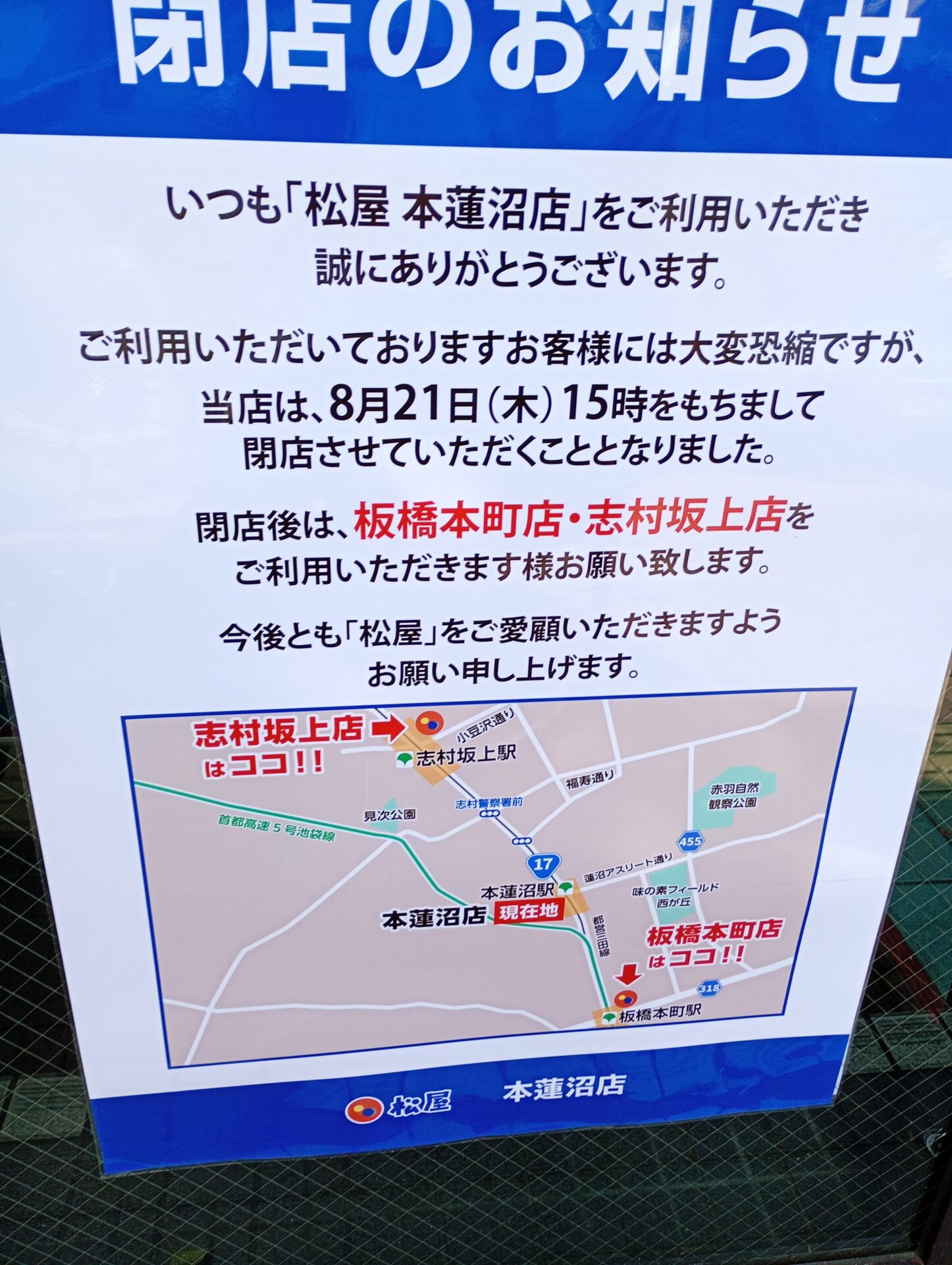 2025年8月21日15時本蓮沼駅前の「松屋本蓮沼店」が閉店となります。松屋本蓮沼店がテナントに入っている「鈴木総合家具センター」さんの建物の解体工事に伴い、現在のテナントを8月末までに閉鎖する必要があるという事情があるそうです。お隣に軒を構えている「満点酒場本蓮沼店」も8月24日㈰をもって閉店となります(ときわ台に移転)。駅前の松屋が無くなるのは痛いですね。