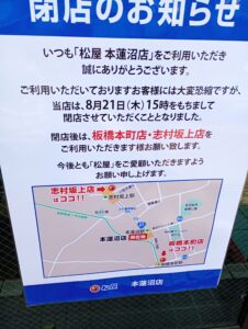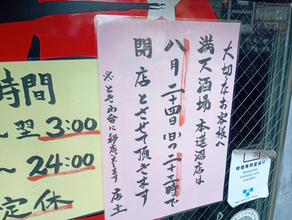 2025年8月24日㈰本蓮沼駅の「やきとん 満点酒場」さんが閉店し、ときわ台に移転することになりました。松屋本蓮沼店がテナントに入っている「鈴木総合家具センター」さんの建物の解体工事に伴い、現在のテナントを8月末までに閉鎖する必要があるという事情があるそうです。お隣に軒を構えている「松屋本蓮沼店」も8月21日頃に閉店となります。駅前の深夜まで営業している居酒屋が無くなるのは痛いですね。