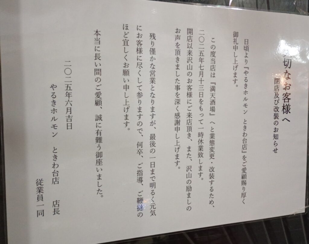 2025年7月13日に「やる気ホルモンときわ台店」が閉店し、「満天酒場」へ業態変更すこととなりました。やる気ホルモンときわ台店は2023年9月18日にオープンして、2年での閉店となりましたので少し不思議な気がしましたが、背景には板橋区内の「満点酒場本蓮沼店」の閉店があるそうです。つまり、「満点酒場本蓮沼店」がときわ台に移転するということですね。