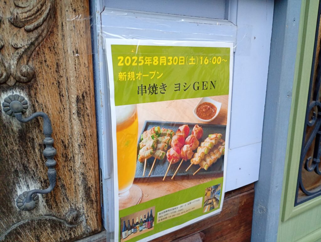 2025年8月30日㈯旭町の飲み屋が集う通りにあるフォカッチャディレッコ500さんの跡地にに「串焼きヨシGEN」さんがオープン予定となります。オーナーのヨシさんと店長のGENさんがいらっしゃったので、お店についてお話を伺わせて頂きました。
