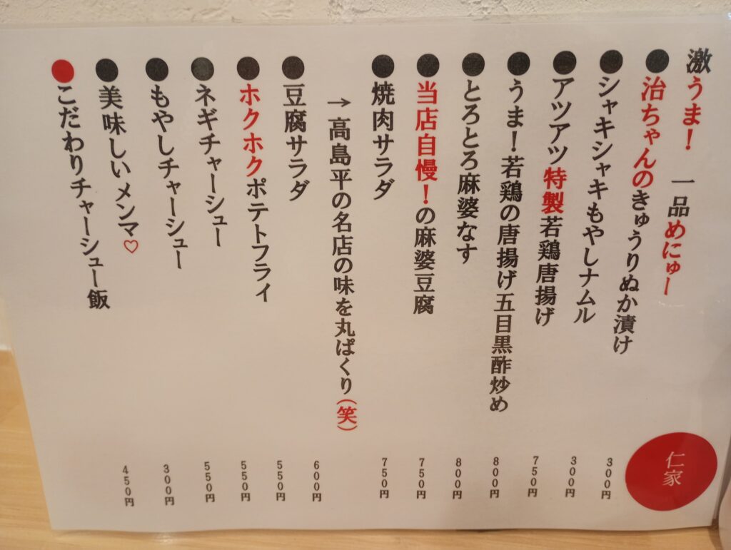 濃厚仁家豚骨醤油らぁ麺が780円、濃厚仁家醤油つけ麺900円、また、各種トッピングが並んでいます。