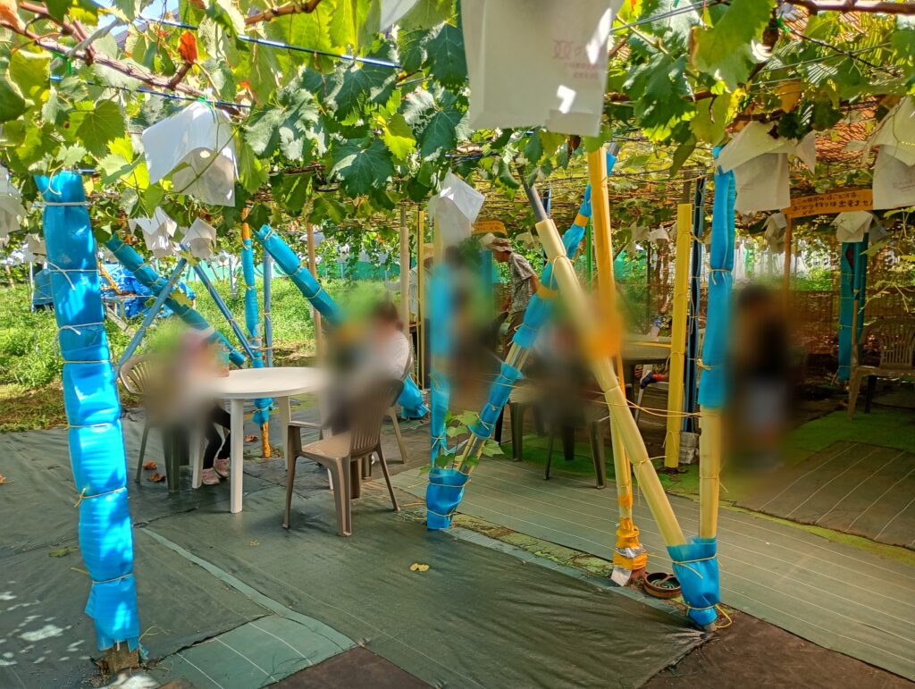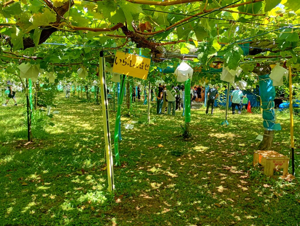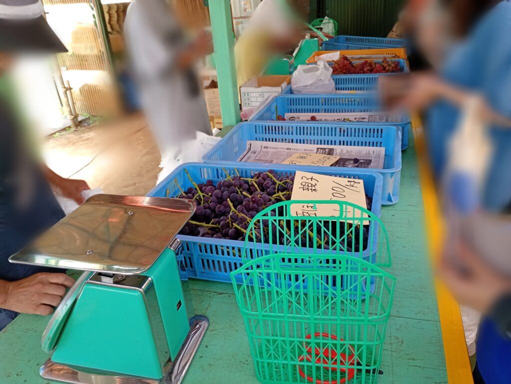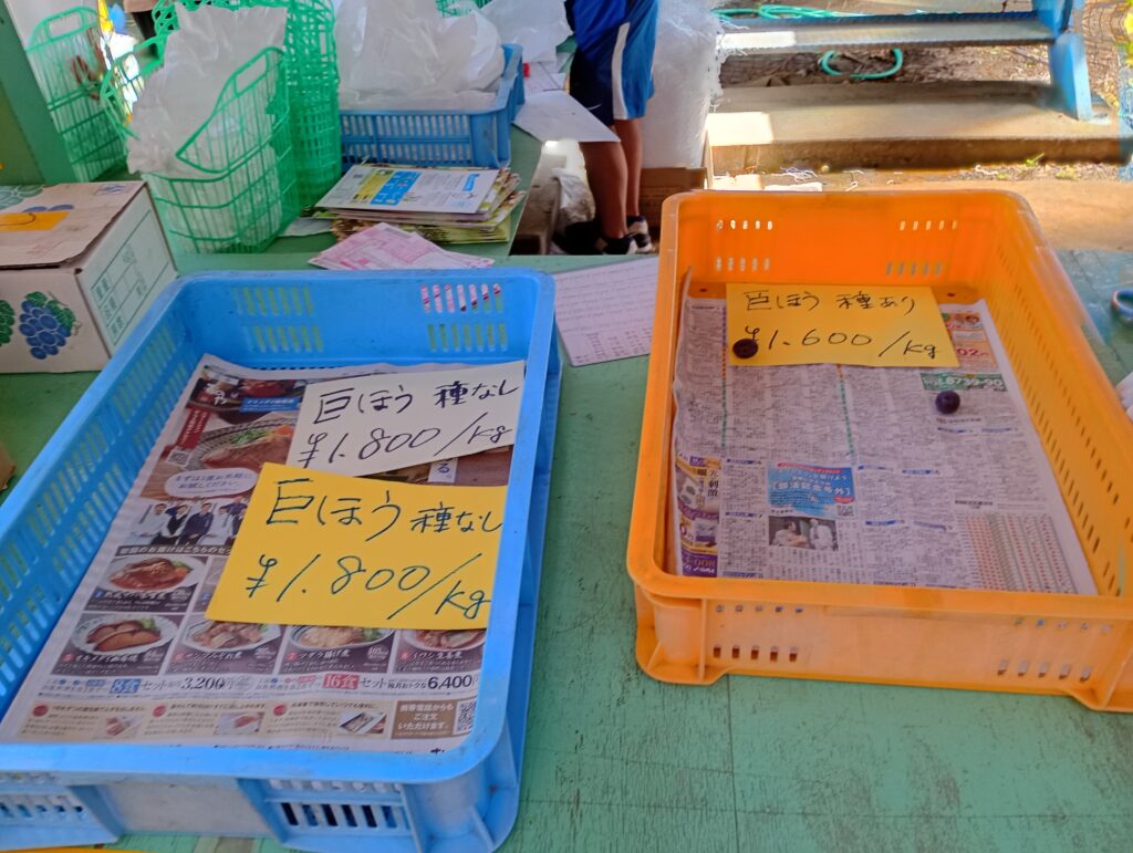 シャシンマスカットの販売は朝一で終わってしまったそうで、既にケースがありませんでした。また、巨峰のケースは空になっていましたが、スタッフの方が収穫して補充されていくようです。タイミングで購入できたりというのもあるのかもしれません。