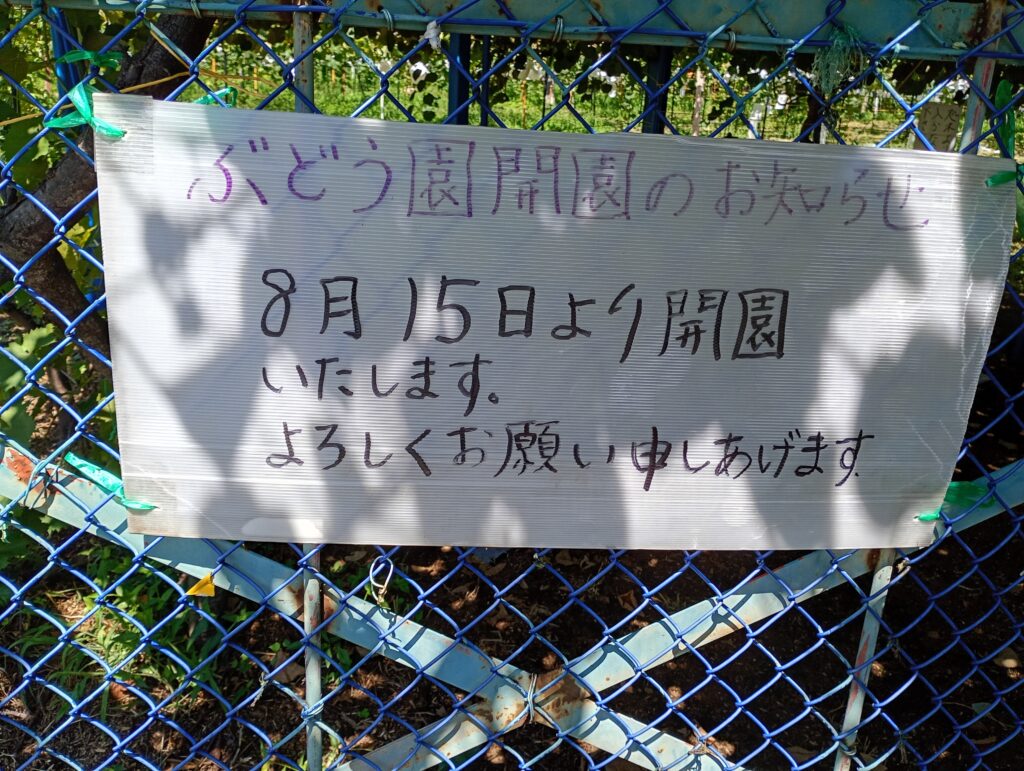 | 開園 | 2025年8月15日㈮ ※ぶどうが無くなり次第営業終了となりますので、例年1~2週間程度の営業となることが多いそうです。 |