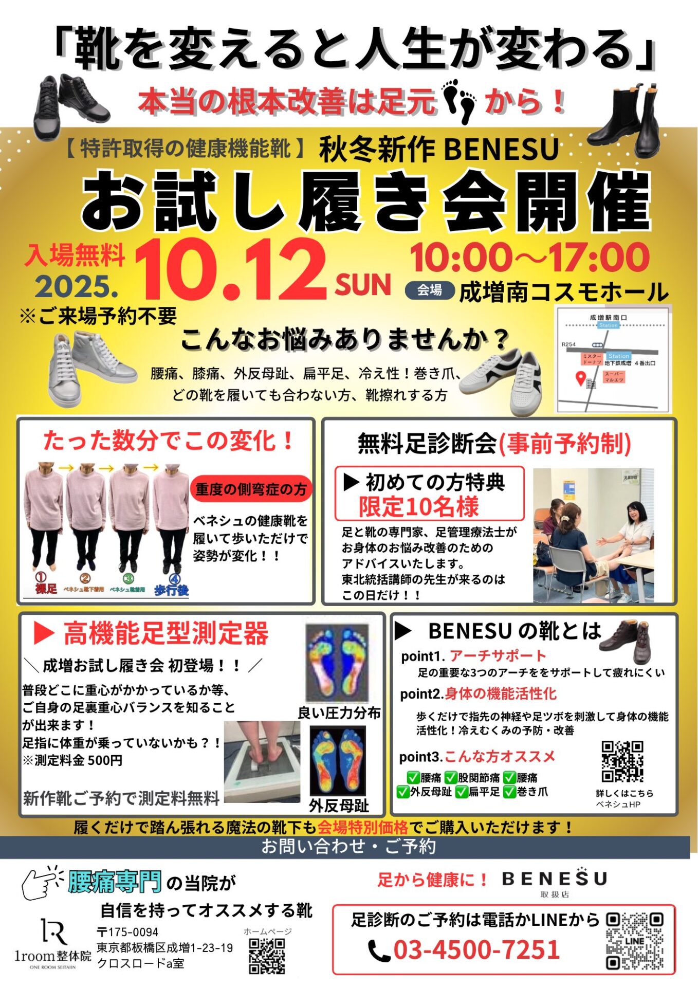 2025年10月12日㈰成増南コスモホールにて「秋冬新作 ベネシュ健康機能靴 お試し履き会」が開催されます。