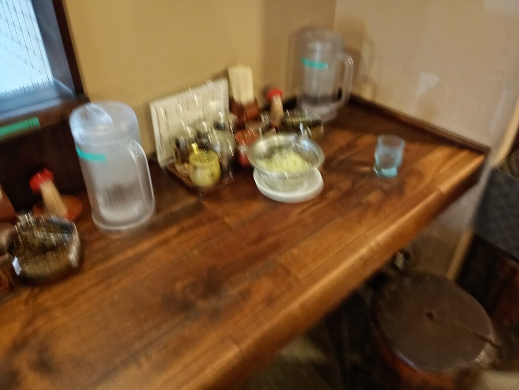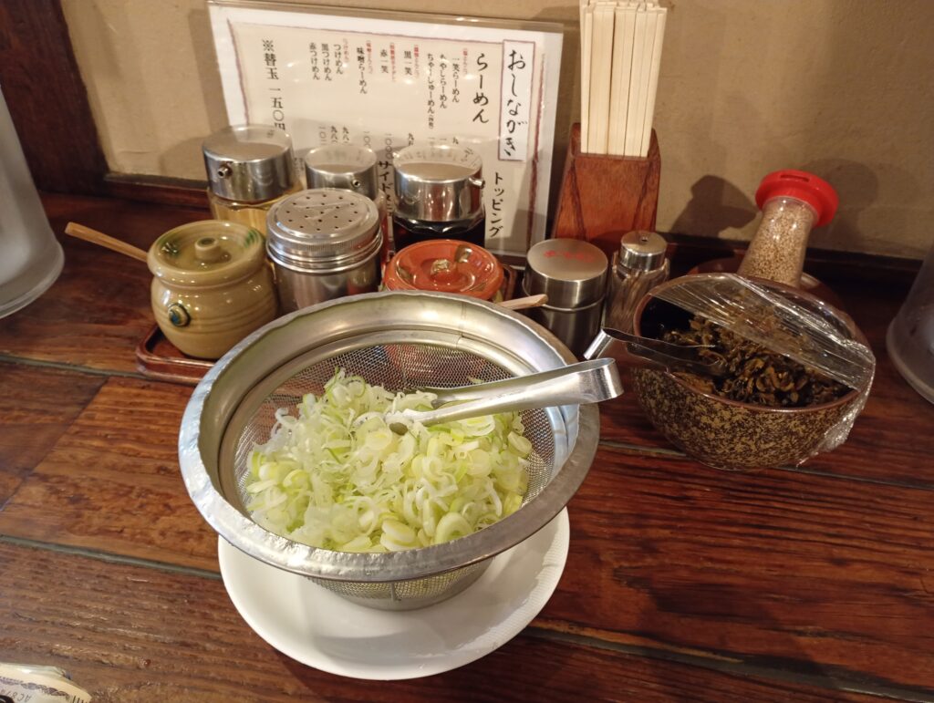 カウンターに案内してもらいました。テーブルにはフレッシュな長ネギが置かれています。それ以外にも、高菜、ごま、にんにく、辛味噌もトッピングとして無料で用意されています。