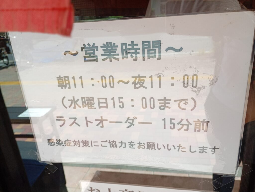 | 営業時間 | 11時00分~23時00分 ※水曜日のみ15時閉店 |