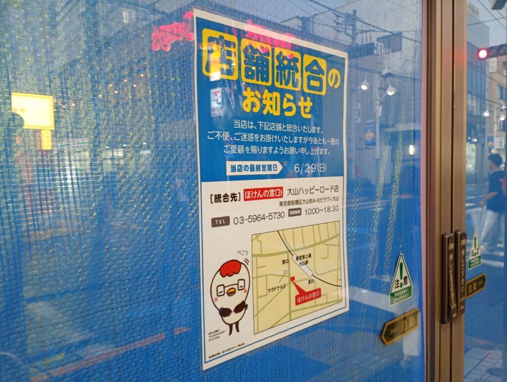 2025年6月29日をもって保険の窓口上板橋駅前店が閉鎖され、大山ハッピーロード店と統合することになりました。これまで店舗数を伸ばしてきた業界最大手が閉店することとなりました。