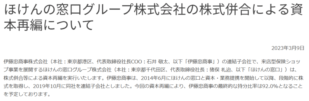 伊藤忠商事は、2014年に「ほけんの窓口グループ」と資本・業務提携を開始して以降、段階的に株式を取得してきました。そして、2019年には株式の過半数(57.7%)を取得し、連結子会社化しました。さらに、2023年には株式併合を含む資本再編を実施し、持ち分比率を92.0%まで引き上げています。