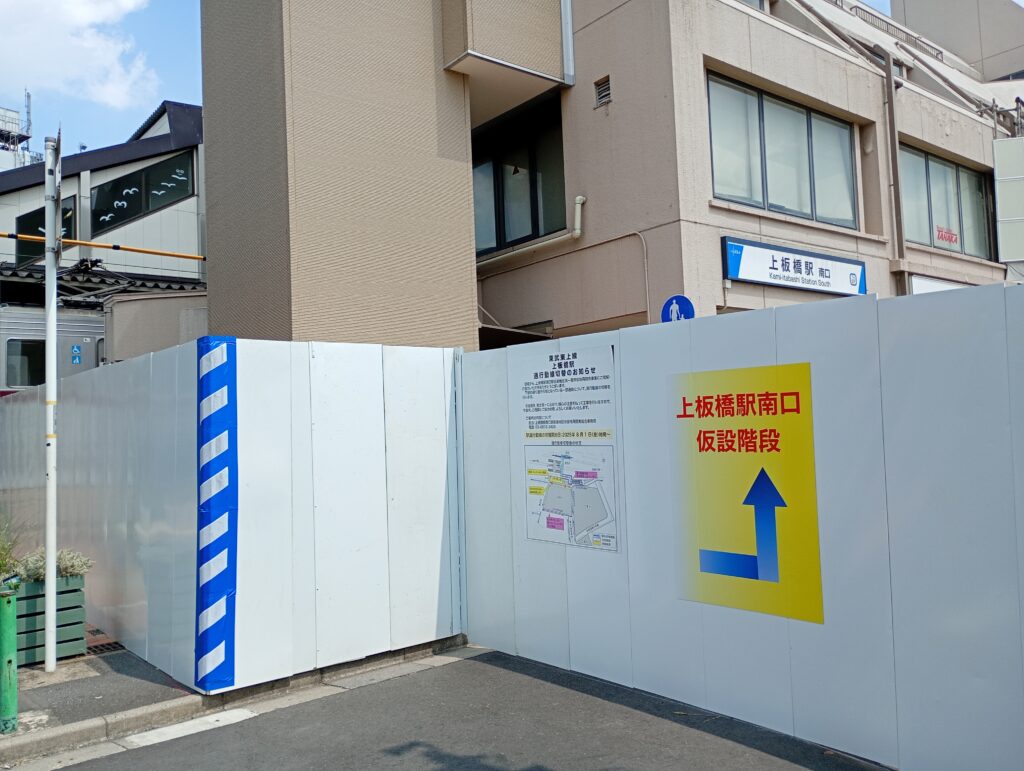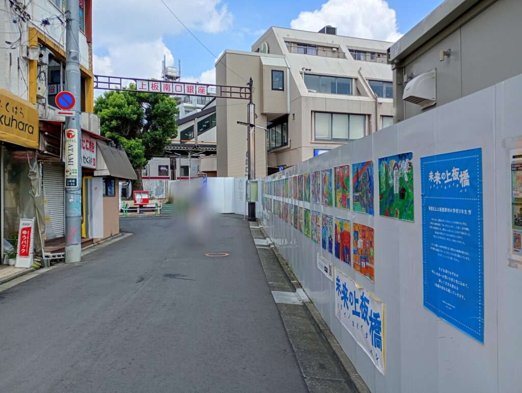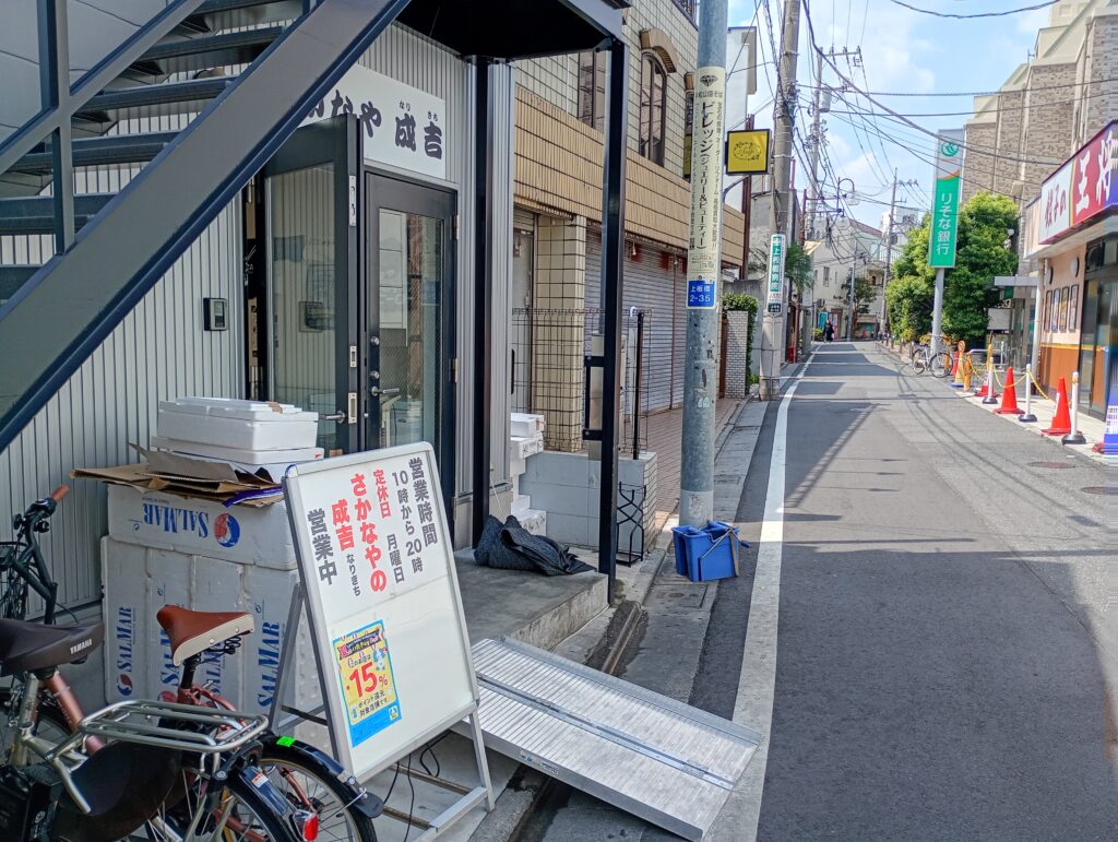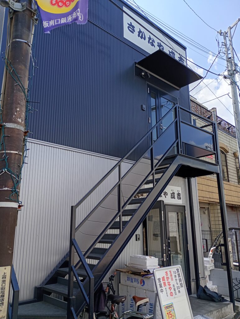 さかなや成吉さんは上板橋の南口に所在しています。(現在工事中の)上板南口商店街に出る方の階段を降りて線路沿いにまっすぐに10m位進むとあります。
