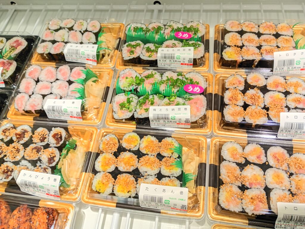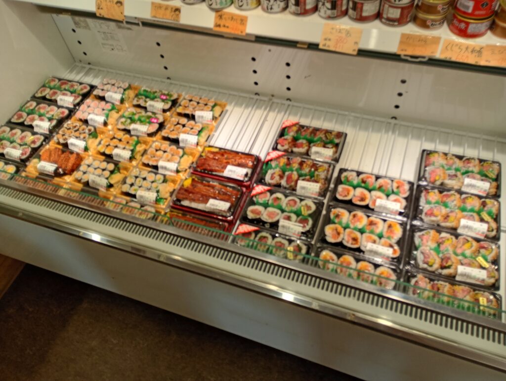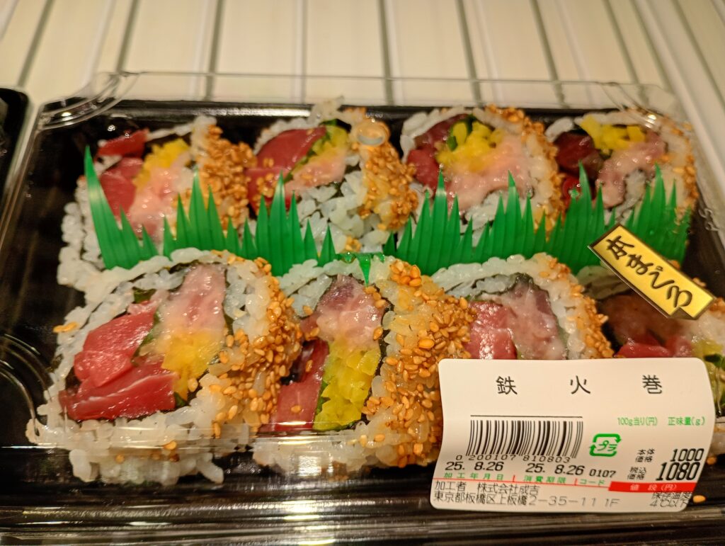 お寿司も巻物を中心にご覧の品揃えです。鉄火巻はマグロの赤身やトロがふんだんに使われていて1,000円は驚きの価格です。