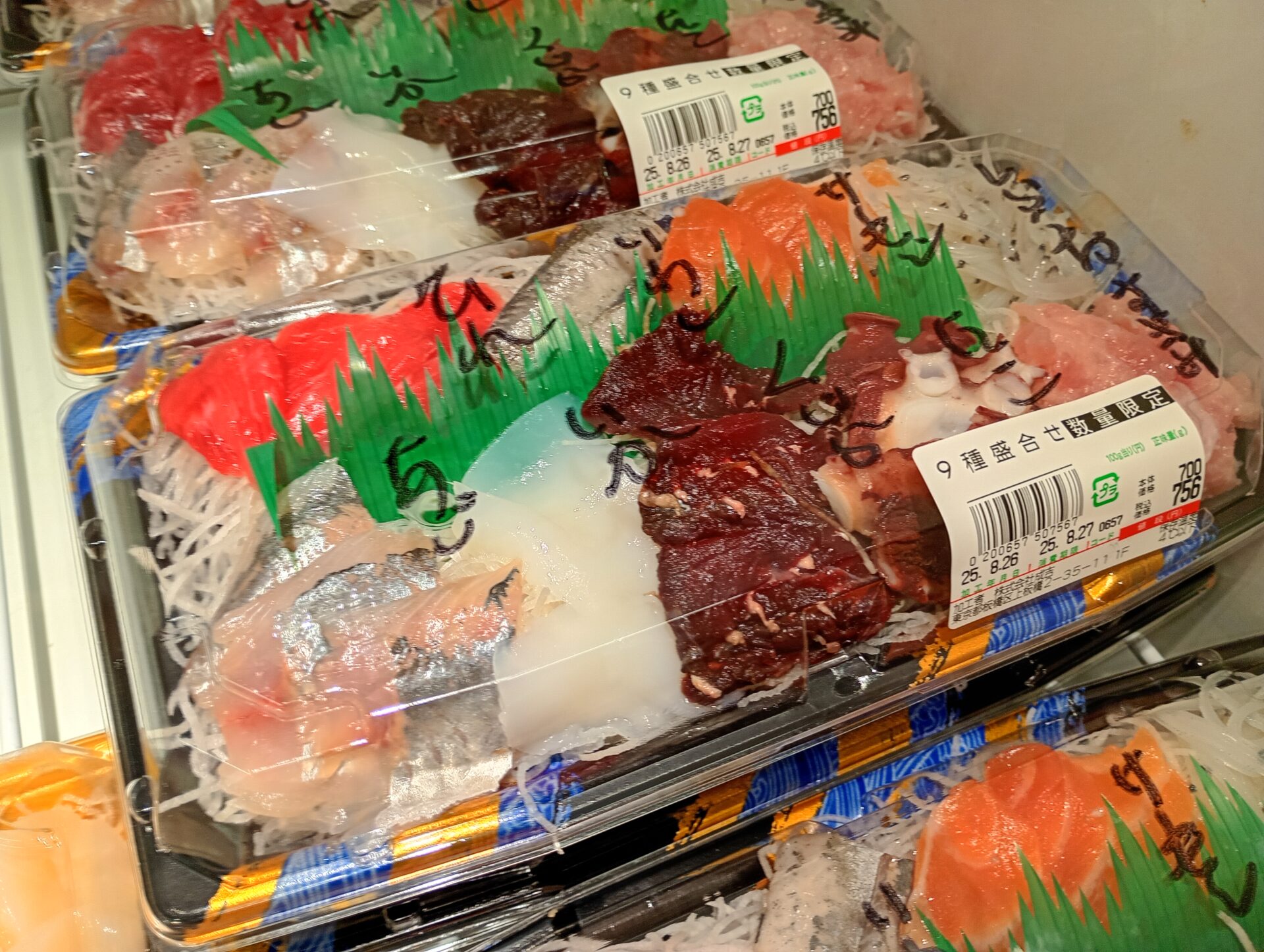 お刺身も美味しそうです。9種類入って700円はかなり安いです。「しらうお」、「くじら」、「ひれ」といった少し珍しい種類のお刺身も入っているのも魅力的ですね。個人的には、タコがとっても美味しかったです。また、子供はクジラに興味を示していました。