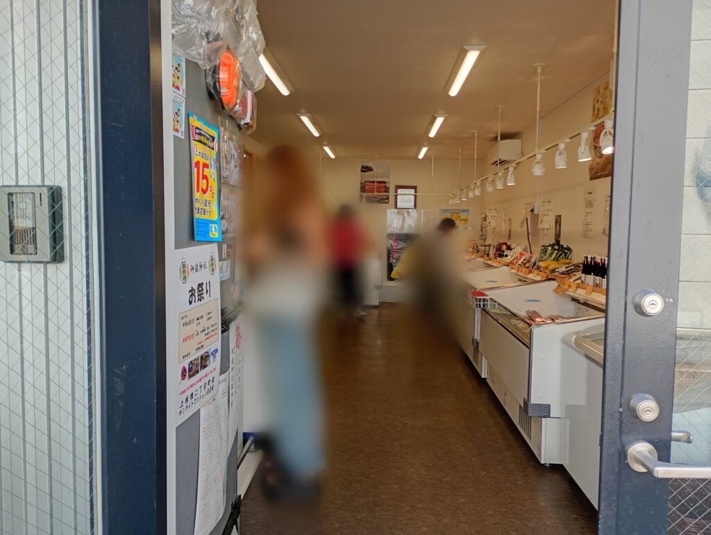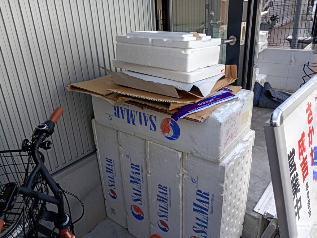 2階建ての建物の1階部分が魚屋さんになっており、2階は事務所になっているようです。店頭には魚の仕入れに使われた発泡スチロールが積まれています。