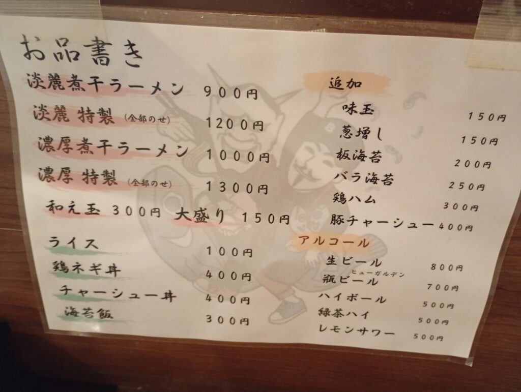 メニューは淡麗煮干しラーメン900円や濃厚煮干しラーメン1,000円等がオーソドックスだそうです。オーナーが日本全国から取り寄せる様々な煮干しを組み合わせながら丁寧に出汁を取っているそうです。
