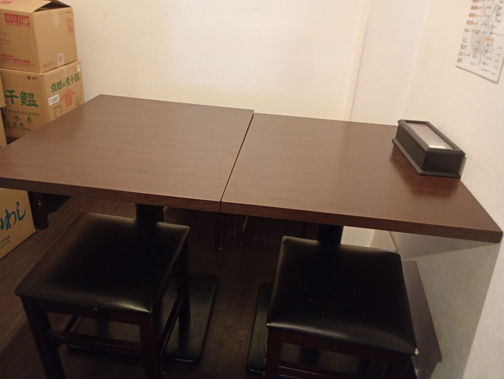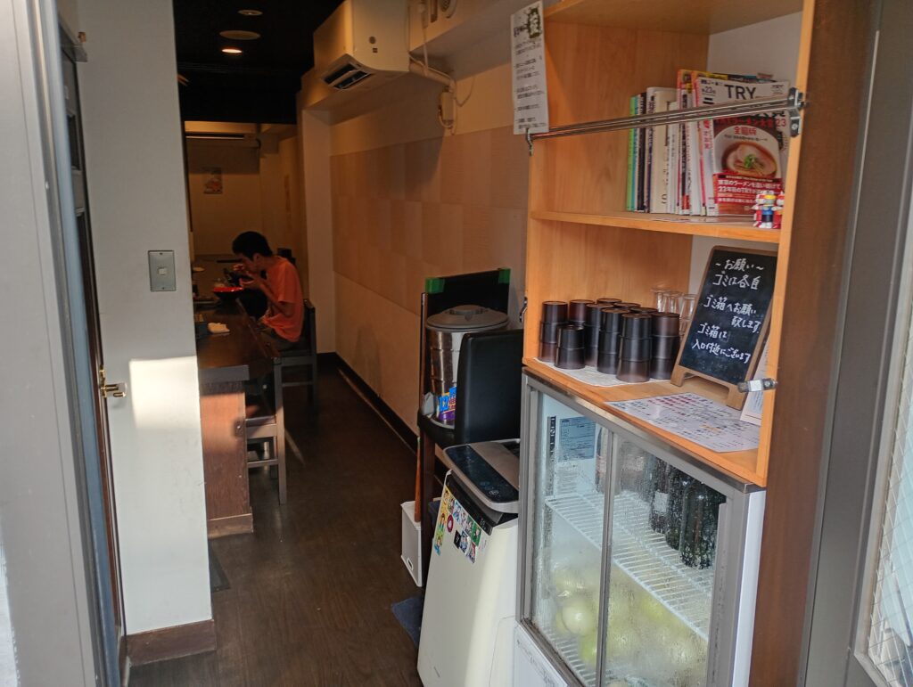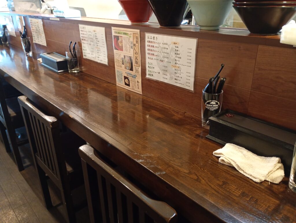 オーナーの許可を得て店内を撮影させて頂きました(ありがとうございます)。店内はカウンター席が手前にあり、奥に4人がけの席があります。
