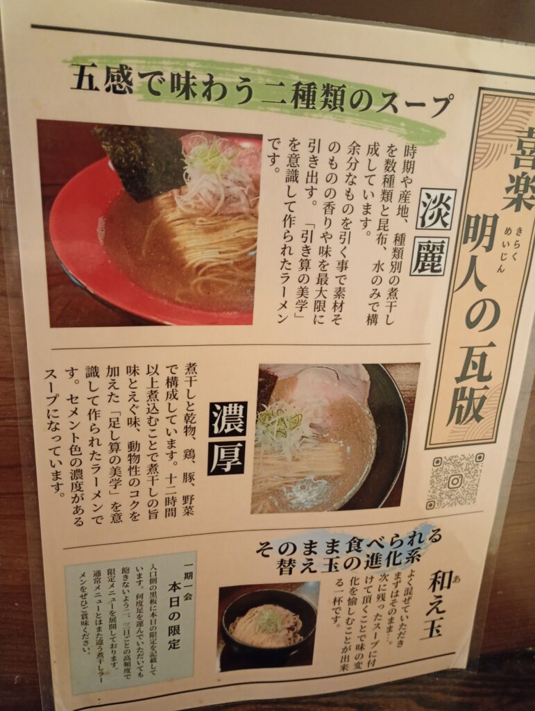 ラーメンの説明も書かれていました。淡麗は引き算、濃厚は足し算で作られているのですね。