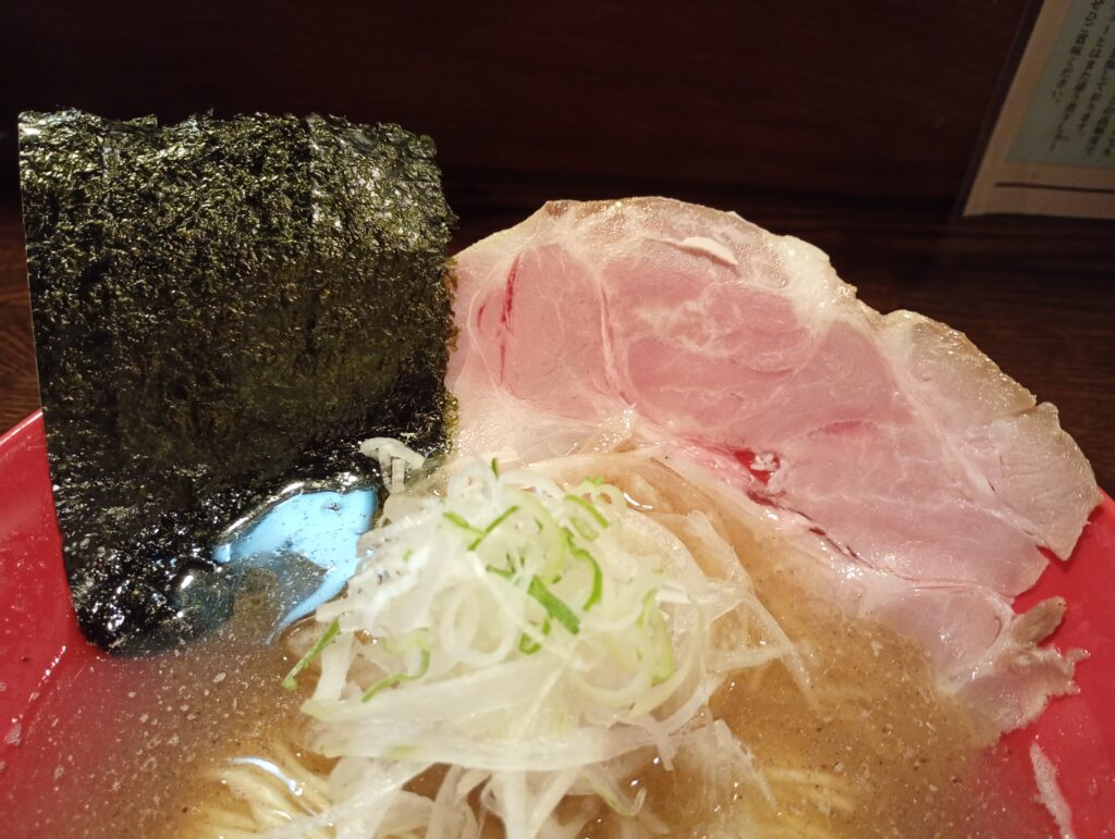 トッピングはチャーシューとネギ、海苔になります。ネギが白いネギの上に緑色のネギが乗っており、彩りを添えてくれます。