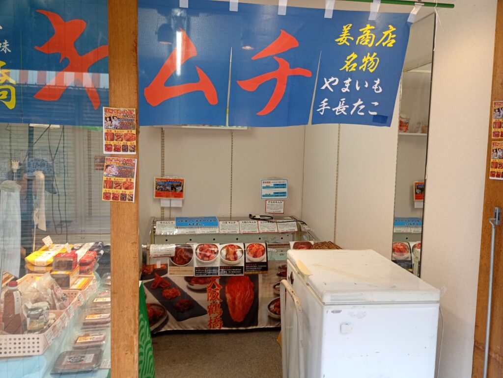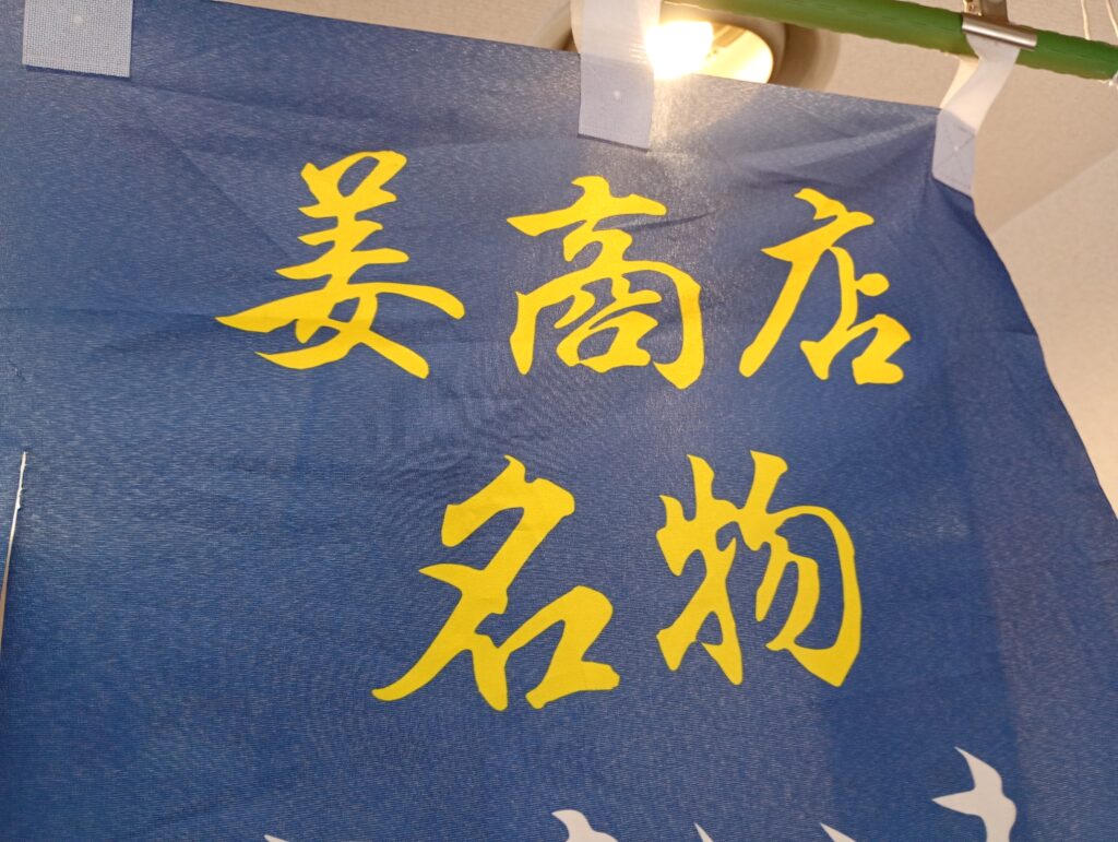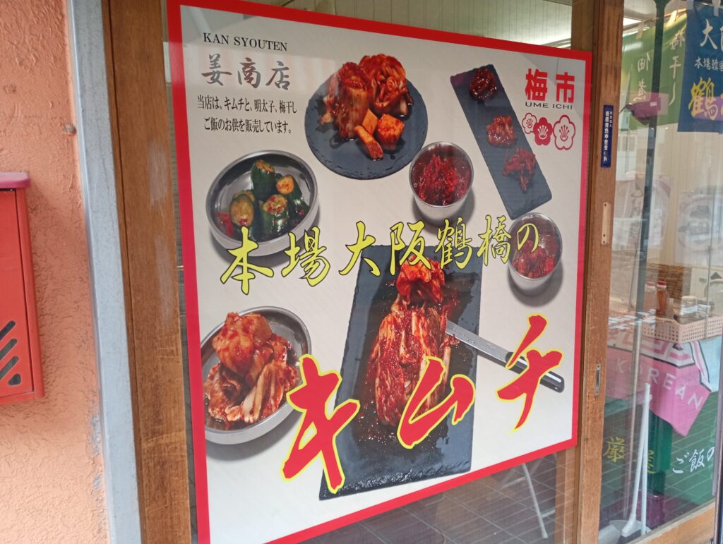 店舗はもともとエスニックのお店があった場所で「本場大阪鶴橋のキムチ」と大きく書かれ、のれんには「キムチ姜商店」とあります。