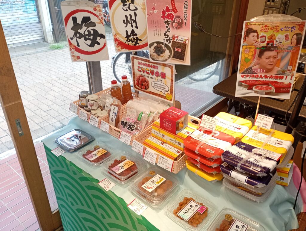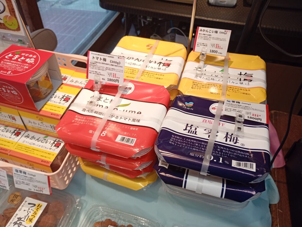 店内はこじんまりしたスペースなのですが、入って左手に梅干しが積まれています。マツコの知らない世界で紹介された「トマト梅」がおすすめみたいです。「みかんこい梅」も気になりますね。
