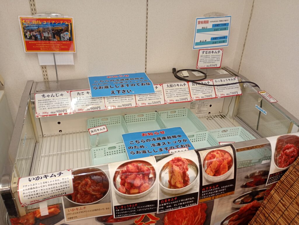 店の奥に冷蔵庫があり、こちらにキムチが並んでいるはずなのですが、今は故障中とのことなのでレジ奥の冷蔵庫に在庫を避難させているそうです。