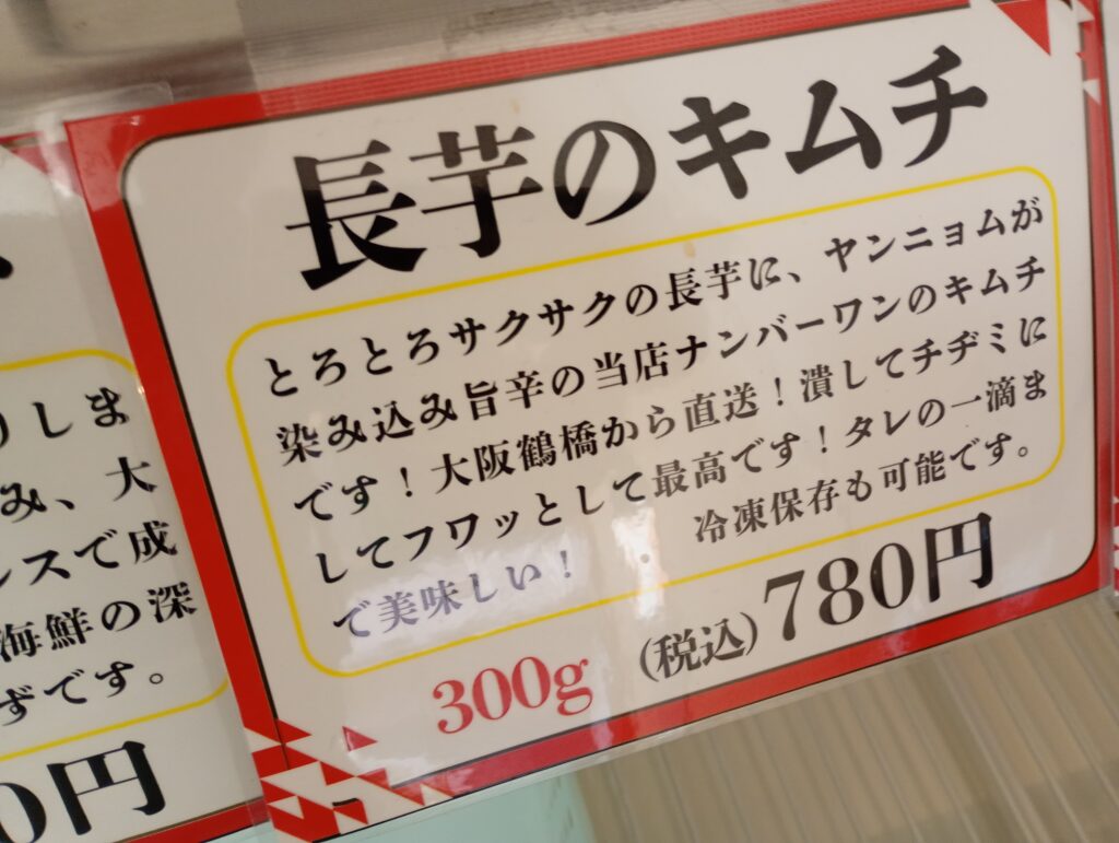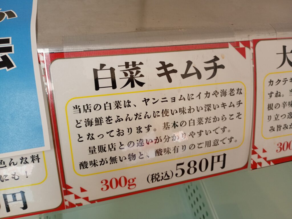 オススメを聞いてみたところ、定番の「白菜キムチ300g」580円や「長芋キムチ300g」780円がよく売れるそうです。