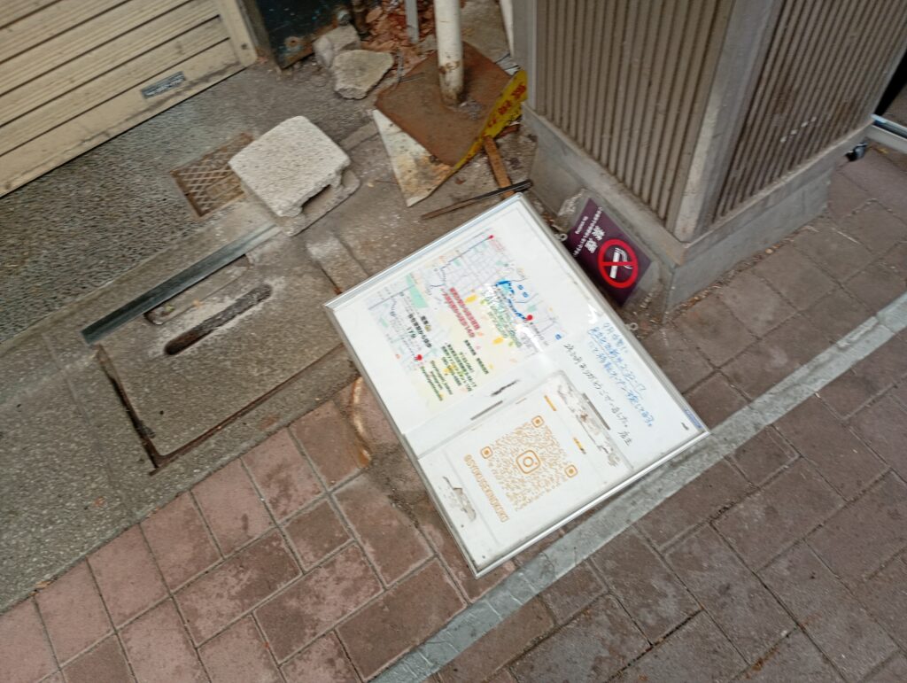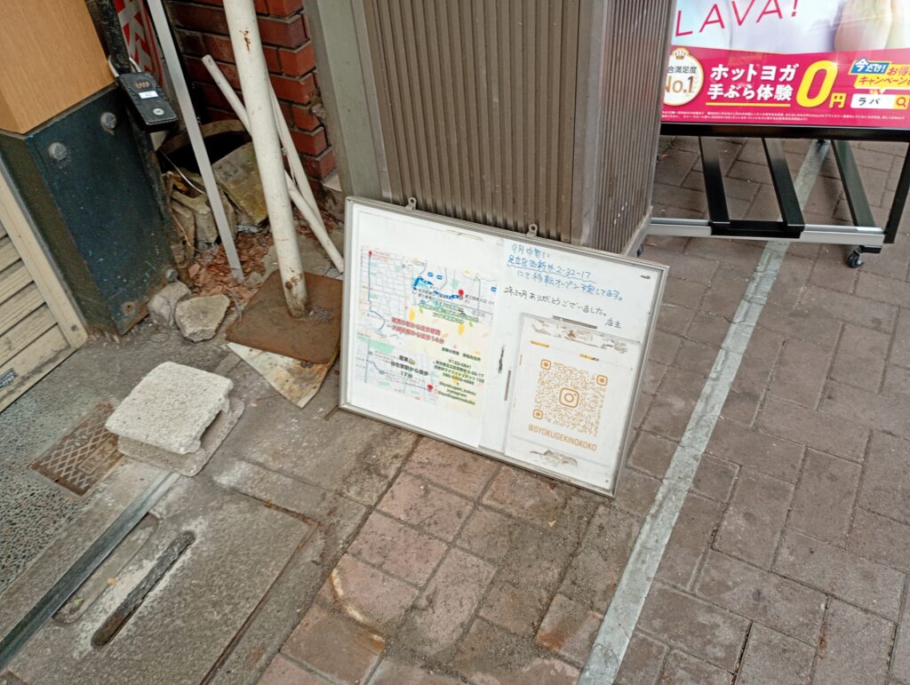 移転後も移転に関する看板がテナント前にありました(倒れていたので、立てかけてみました)。