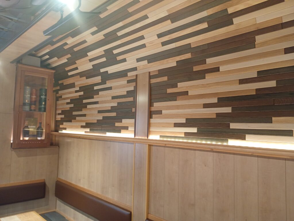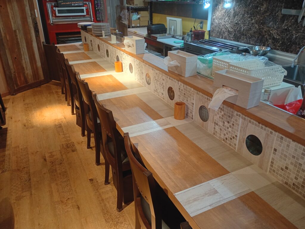 店内は串焼き屋さんというよりもおしゃれな洋食屋さんのような作りになっています。それもそのはず、もともとはフォカッチャディレッコ500というイタリアンレストランがこだわって作った内装を引き継いでらっしゃるそうです。木目を生かした落ち着いた印象で、所々にタイルが張ってあり高級感もあります。