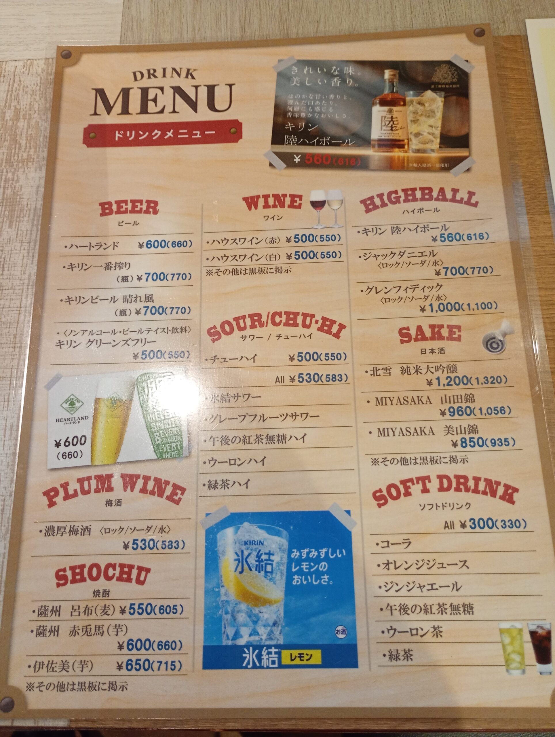 飲物はハートランドの生ビール600円が人気みたいですが、そのほかにも日本酒、焼酎、ワイン、ハイボール、サワーと様々な種類のお酒を堪能することができます。
