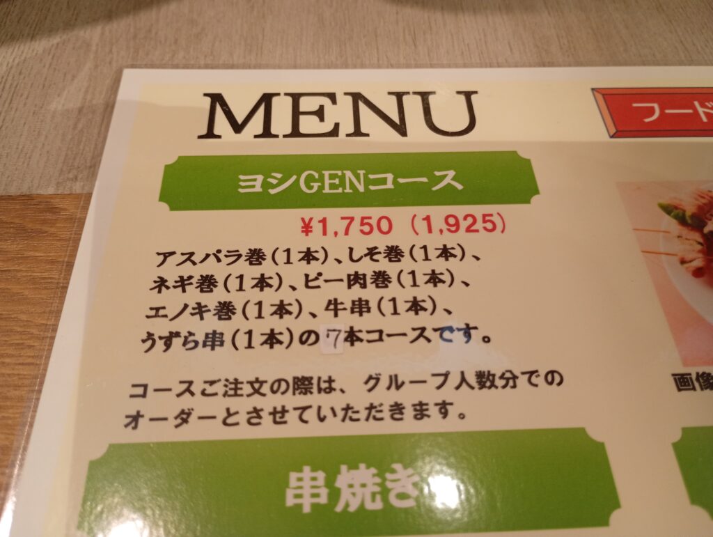 おすすめは「ヨシGENコース」1,750円とのことですので、早速注文させて頂きました。