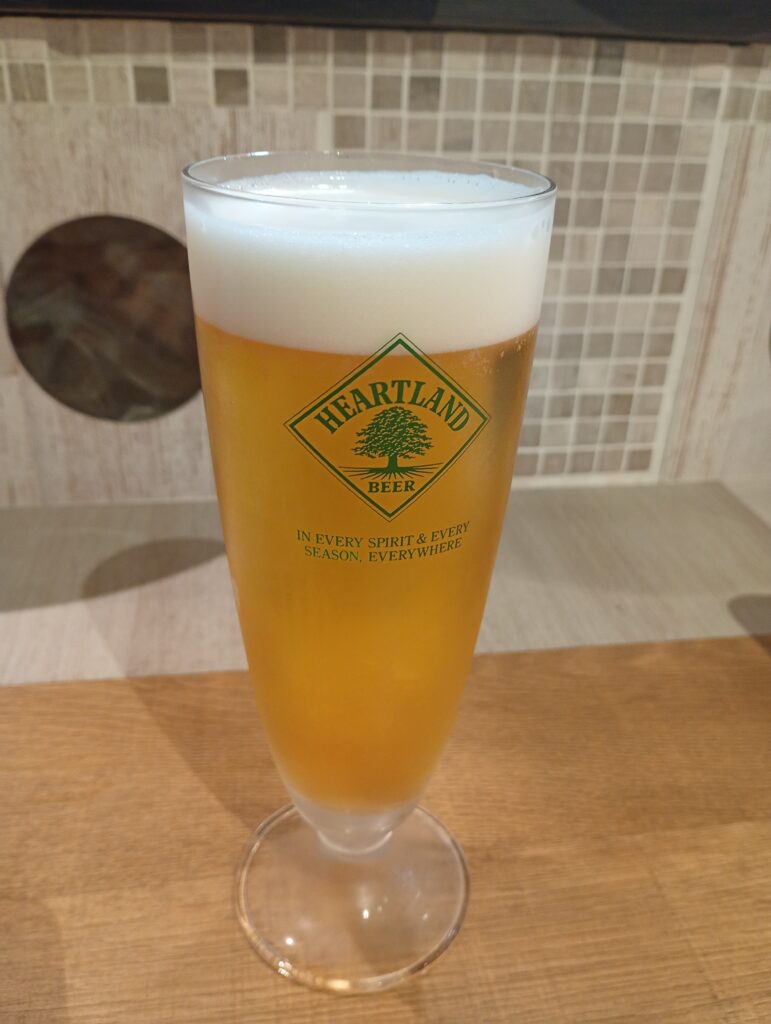 まずはハートランドの生ビール600円が来ました。ハートランドビールは、キリンビールの人気ブランドで、アロマホップの爽やかな香りと、心地よい苦みが特徴です。軽やかで飲みやすい味わいでした。