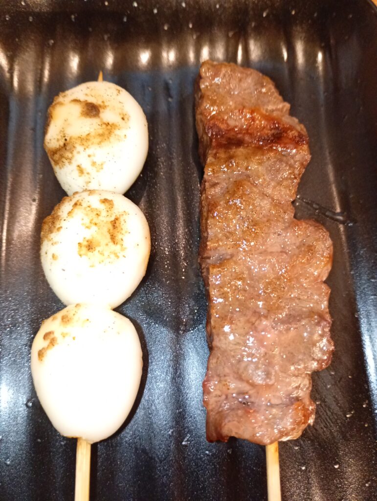 うずら串と牛串になります。牛串はミディアムレアくらいの少し赤みが残る焼き加減で、柔らかくてジューシーでした。よしさんも焼き加減にはこだわっているそうです。