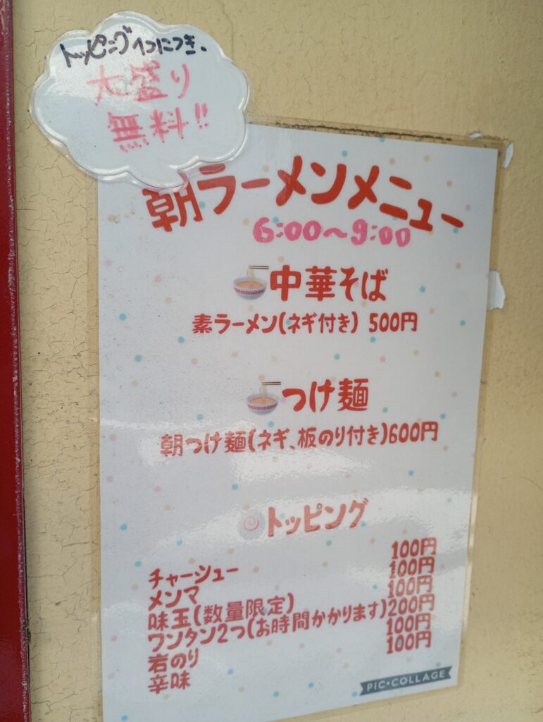 朝ラーメンは500円なのですが、メンマやチャーシュー等をそれぞれ+100円でトッピングできます。トッピングすると大盛りも無料になります。