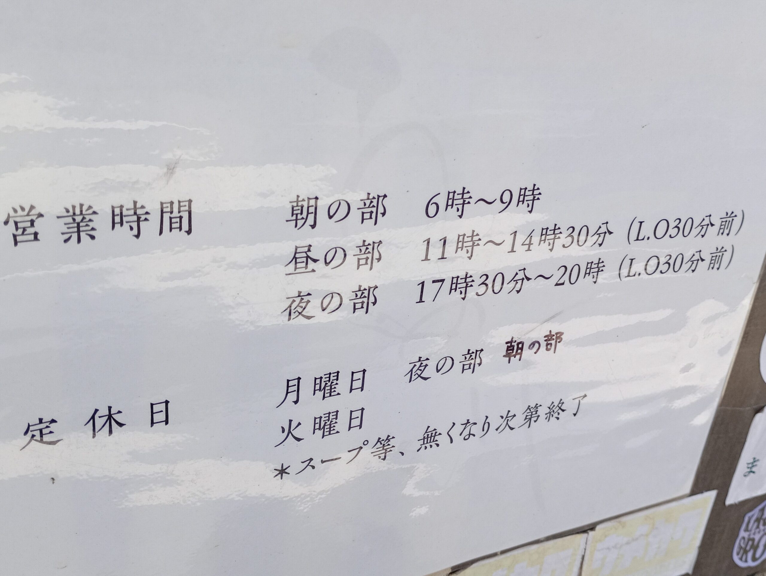 | 営業時間 | 朝:6時00分~9時00分 昼:11時00分~14時00分 夜:17時30分~19時30分 ※月曜日は昼飲み |