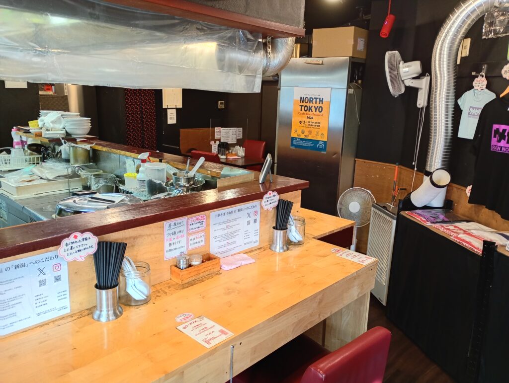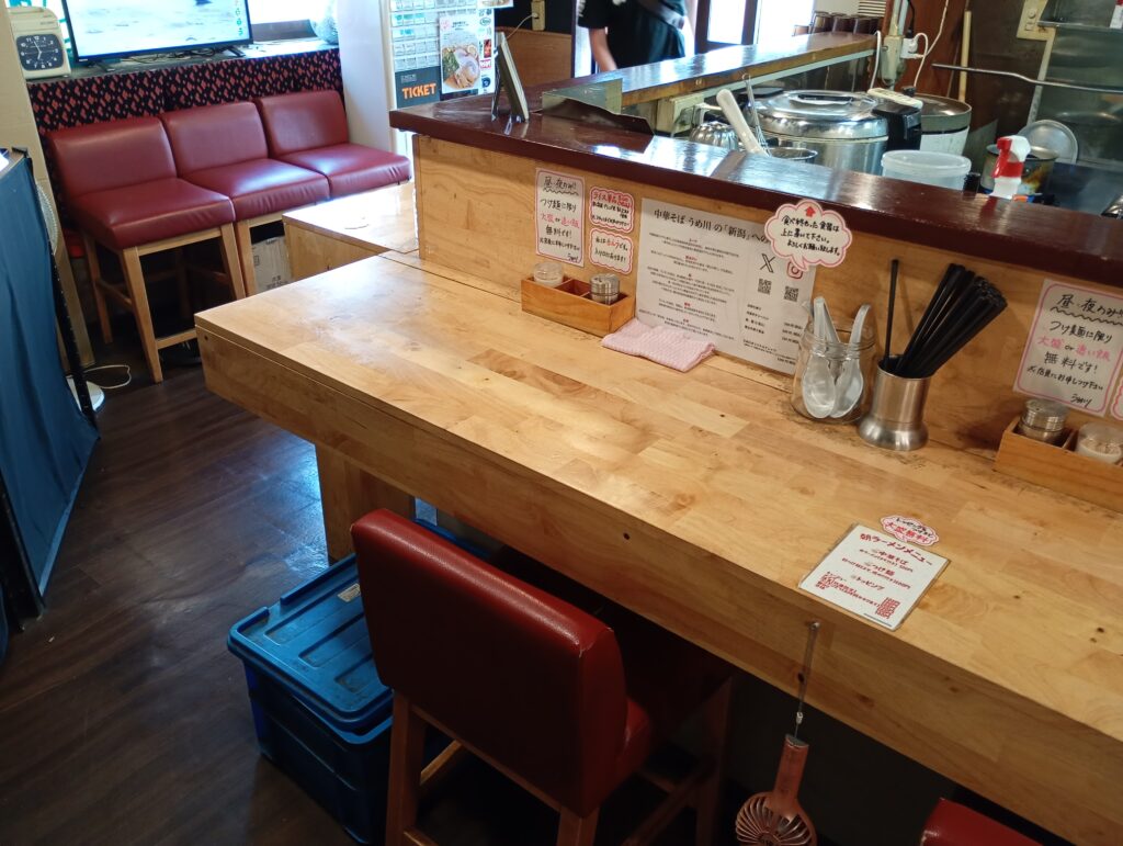 店内はコの字型のカウンター席(7席)とテーブル席(4人掛け)があります。テーブル席があるため、土日などは家族連れが出かける前にお店で朝ラーメンを食べて行くこともあるそうです。