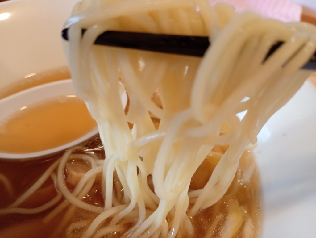 麺は細めんの中華麺でした。新潟製粉所の「万里の里」を使用しており、天然の蒙古王のかんすいと天日干し塩を使用した無添加の麺を新潟来味製麺所から直送してもらっているそうです。
