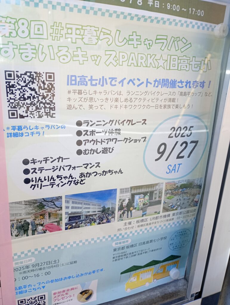 2025年9月27日赤塚公園の近くにある高島第七小学校跡地にて「第8回平暮らしキャラバンすまいるキッズPARK★旧高七小」が開催されます。ランニングバイクレースの「高島平カップ」をはじめ様々なアクティビディが満載です。よかったら遊びに行かれてはいかがでしょうか。