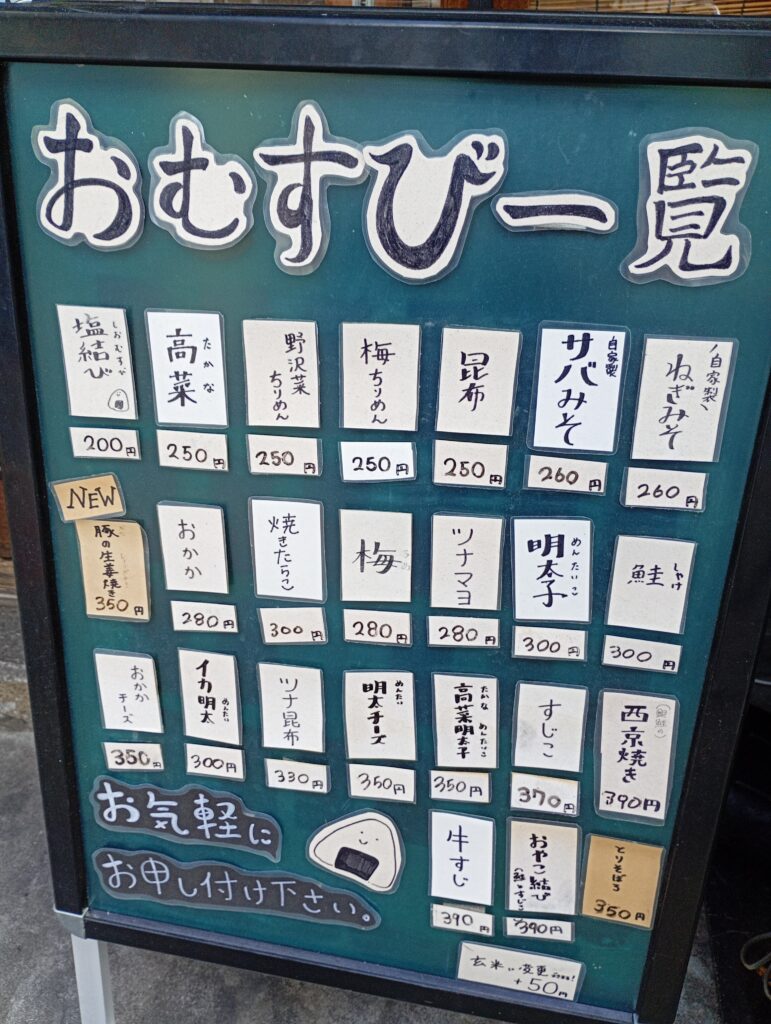 おむすびの具材は定番から変わり種まで20種類以上と豊富です。「塩結び」200円、「鮭」300円、「梅」280円などの定番から、「西京焼き」390円や「牛すじ」390円等の少し変わった具材もあります。個人的には「おやこ結び(鮭とすじこ)」390円がおすすめです。