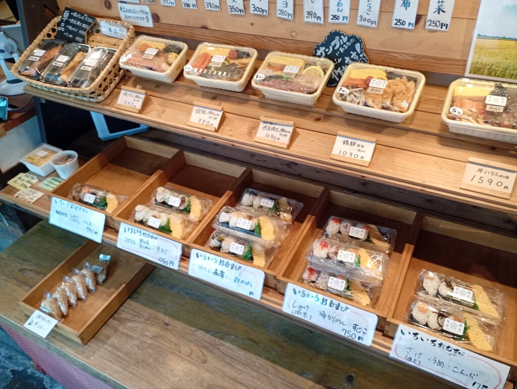 店内には、お弁当が上段に、お結びが下段に綺麗に陳列されています。お結びは店内に陳列していないものでも、お店の方にお声がけするとその場で作ってくれます。