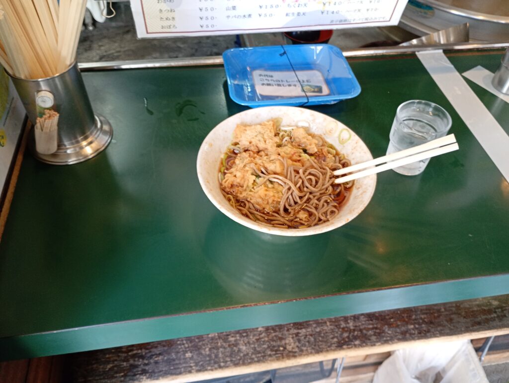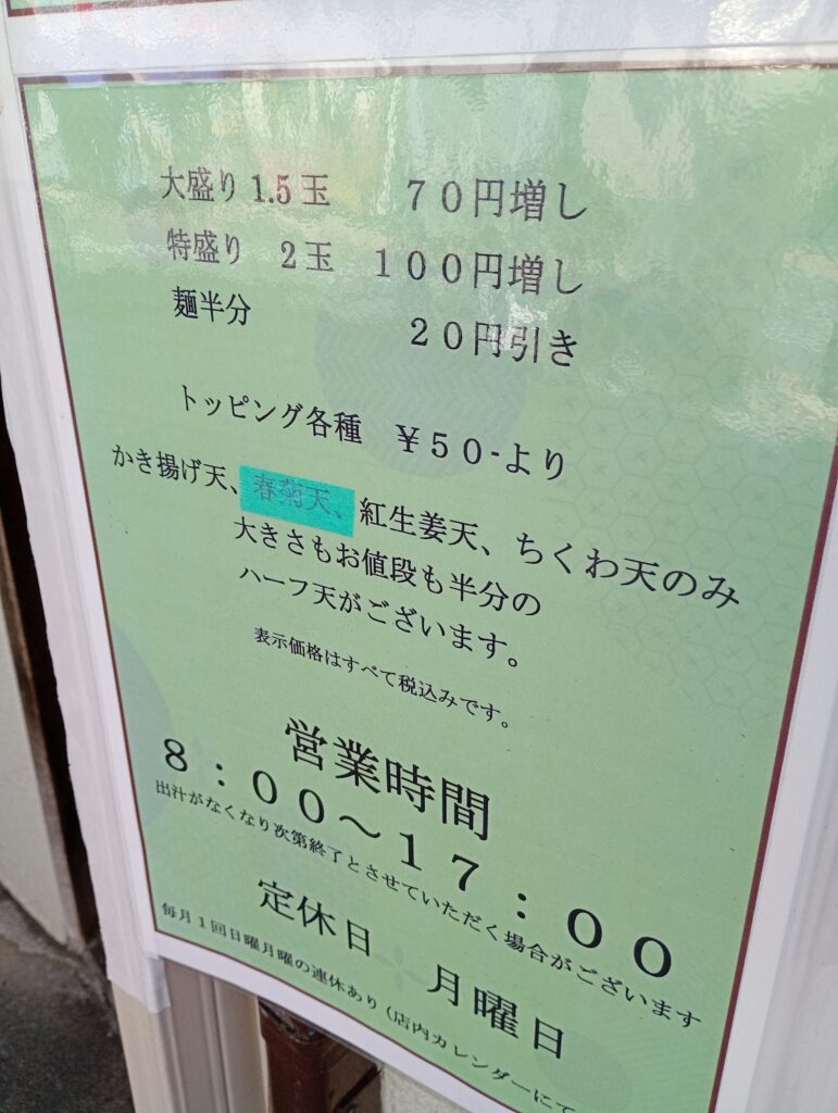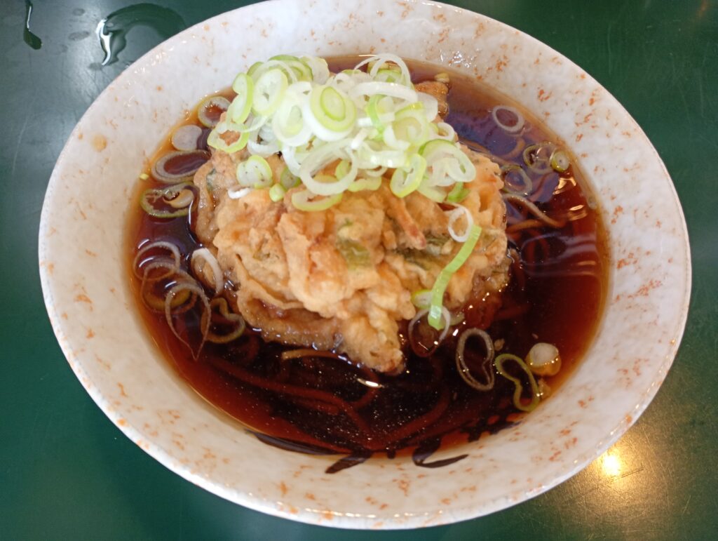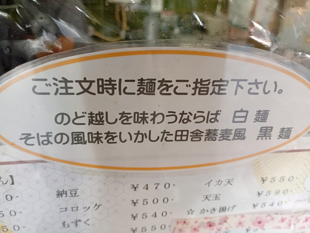 「かけ」が400円で、「かき揚げ天」、「紅生姜天」、「ちくわ天」が540円、「わかめ」、「きつね」等は450円となっています。天ぷらは揚げ置きですが、種類が豊富です。珍しいトッピングとして納豆やもずくなどもあります。