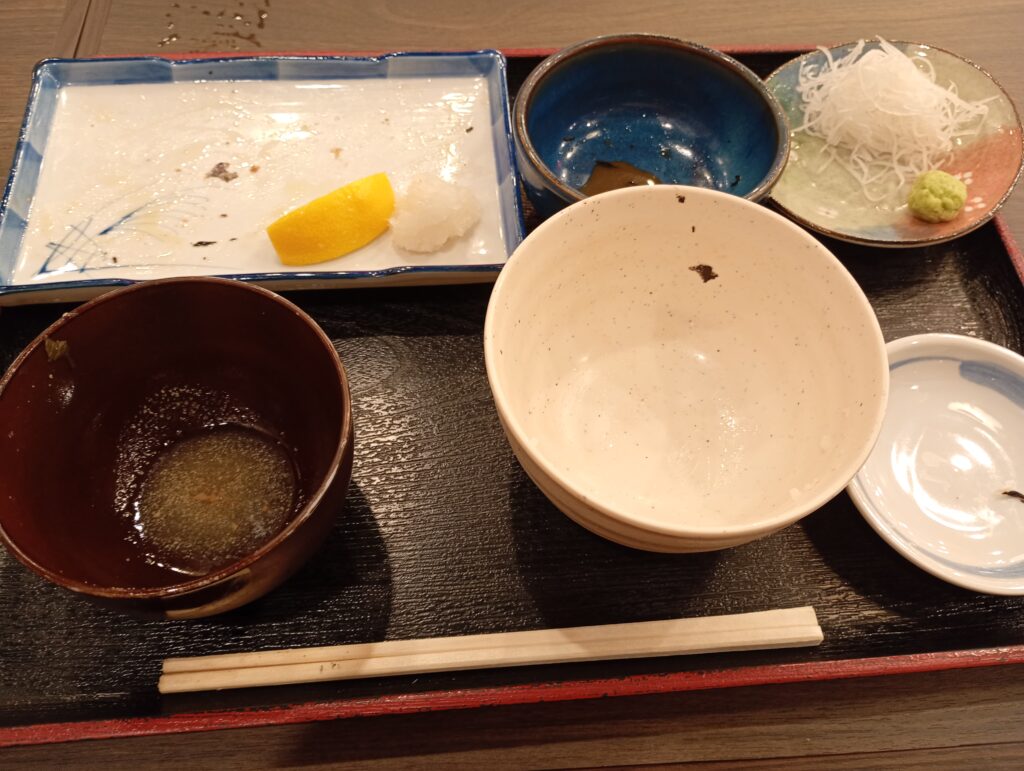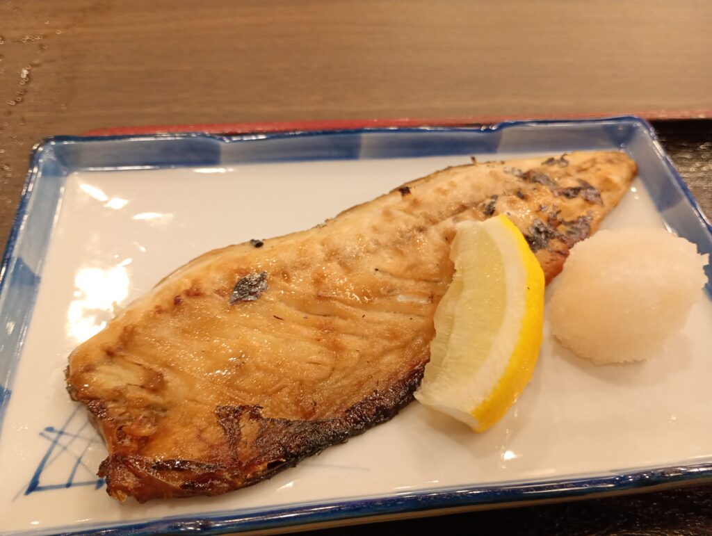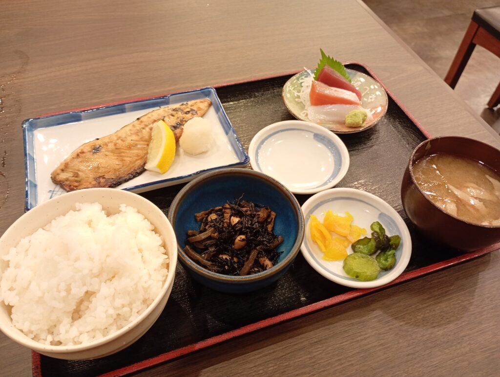 鯖定食を注文してみましたが、サバだけではなく、お刺身やひじきの小鉢、豚汁とおしんこがついて850円はお得ですね。