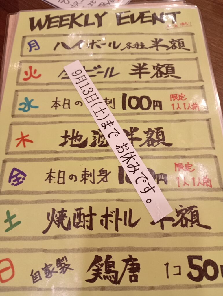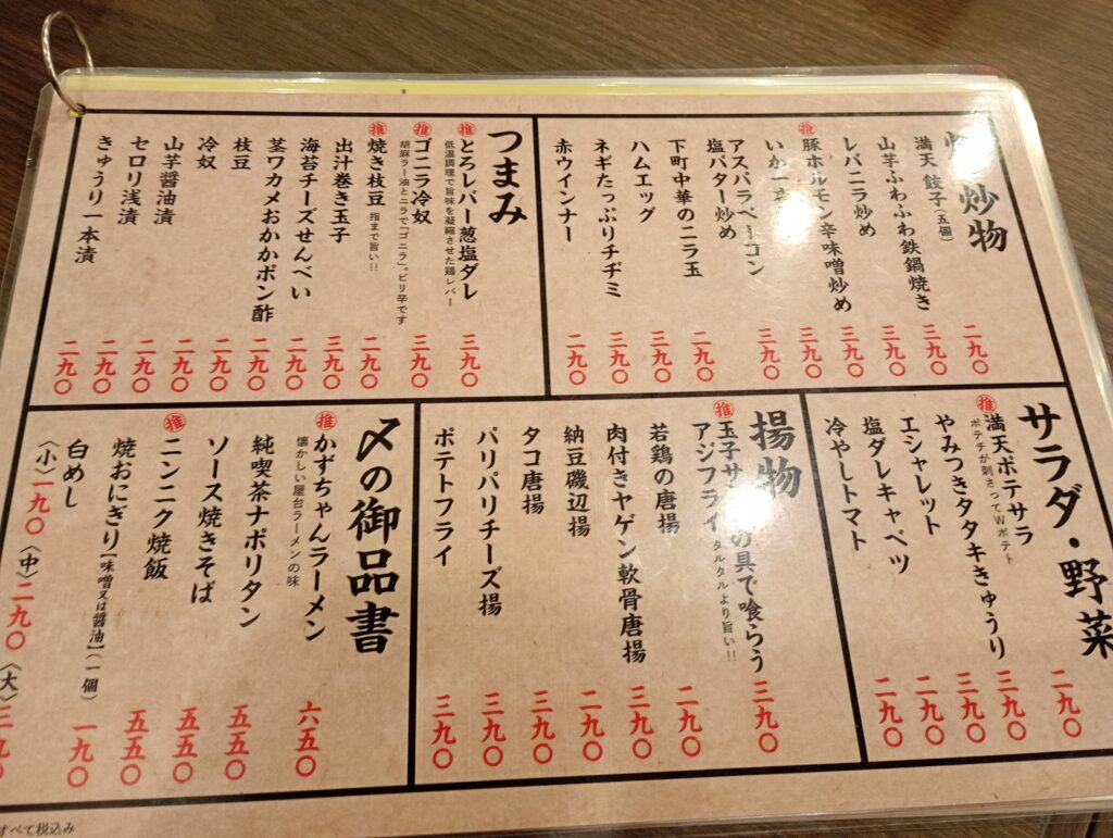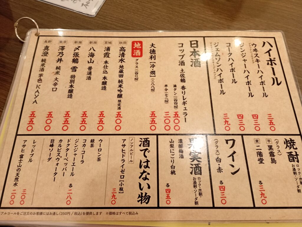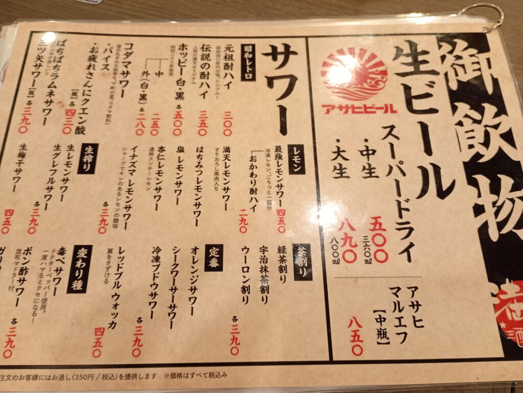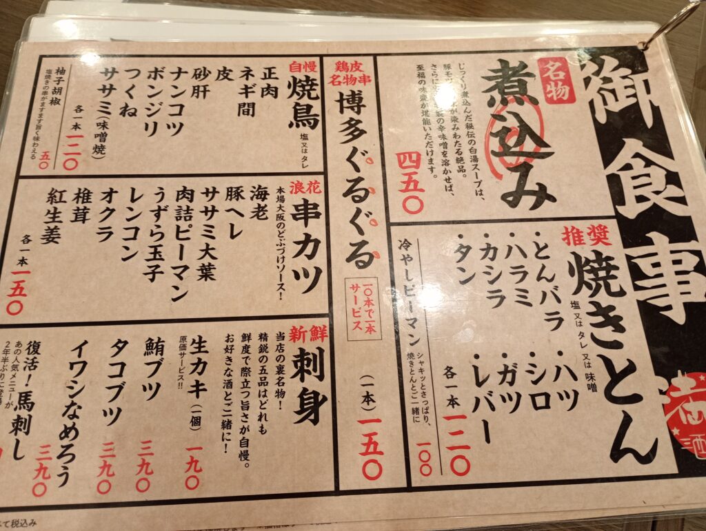 物価高騰が続く中でも、「焼きとん」「焼き鳥」は1本120円(税込)という手頃な価格で提供されています。さらに、各種おつまみは290円から、新鮮な刺身(鮪ブツ、タコブツなど)は390円からと、安くて美味しい料理が目白押しです。
