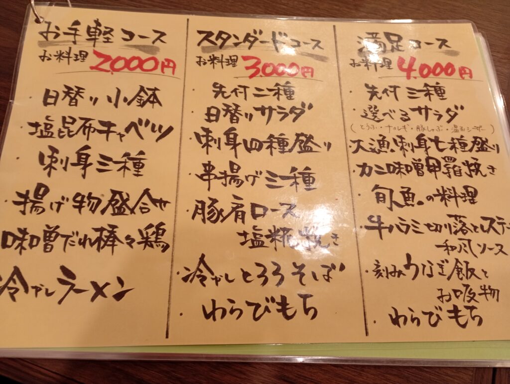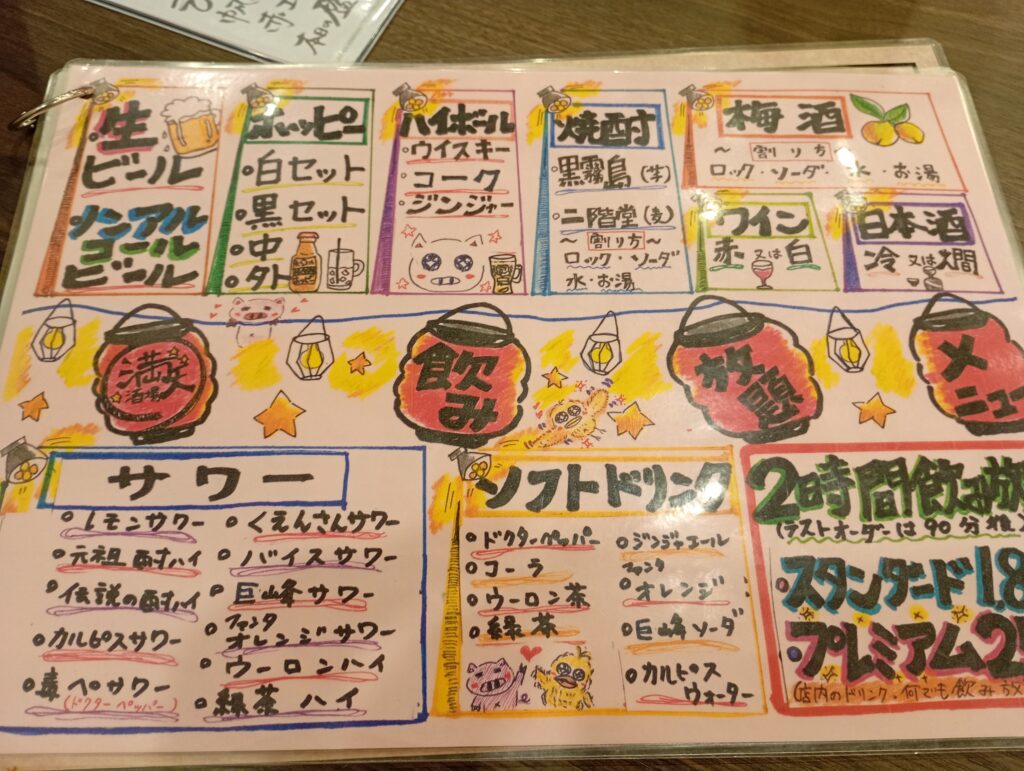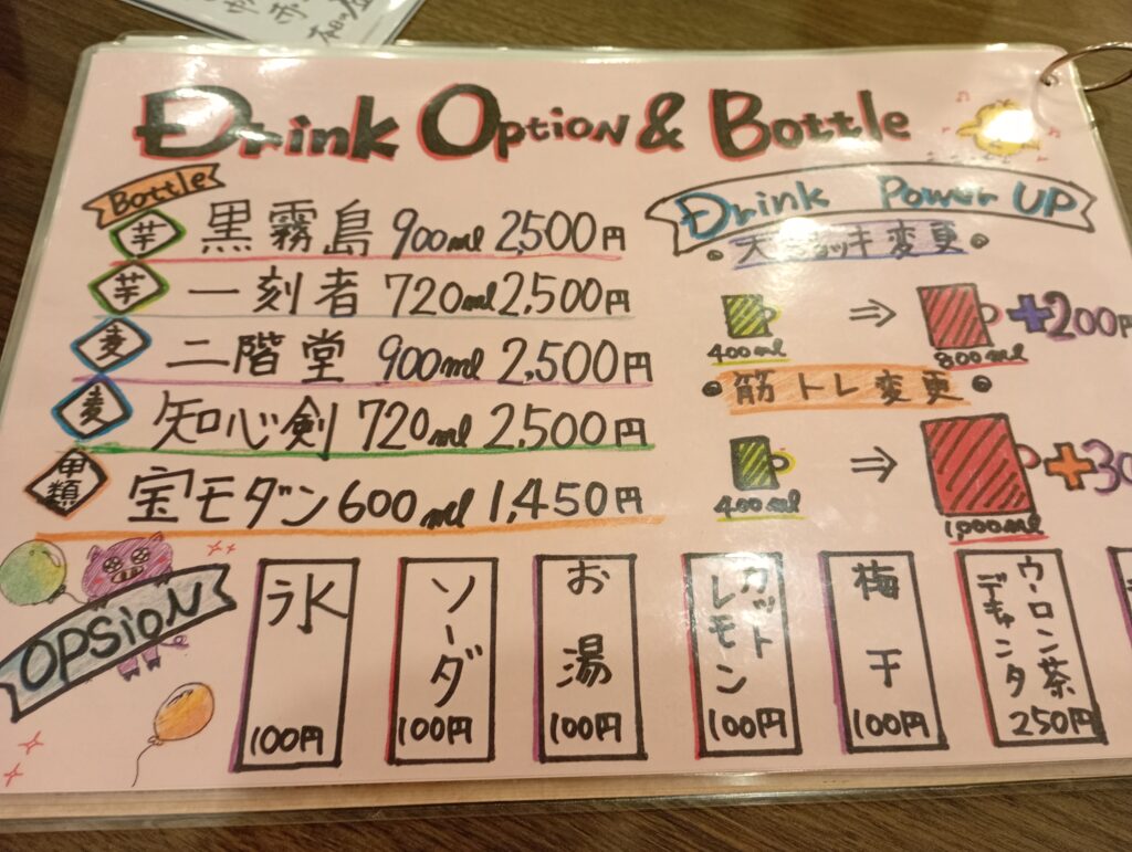 ドリンクメニューはビール、ハイボール、サワー、日本酒、焼酎となんでも揃っており、ボトルや飲み放題コースも用意されています。