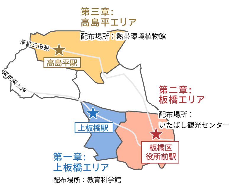 | 場所 | 教育科学館、いたばし観光センター及び熱帯環境植物館の3つの施設を拠点とした、上板橋・板橋・高島平の各エリア |