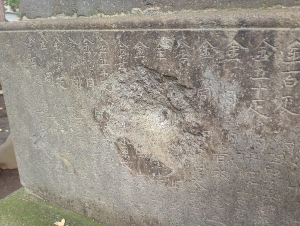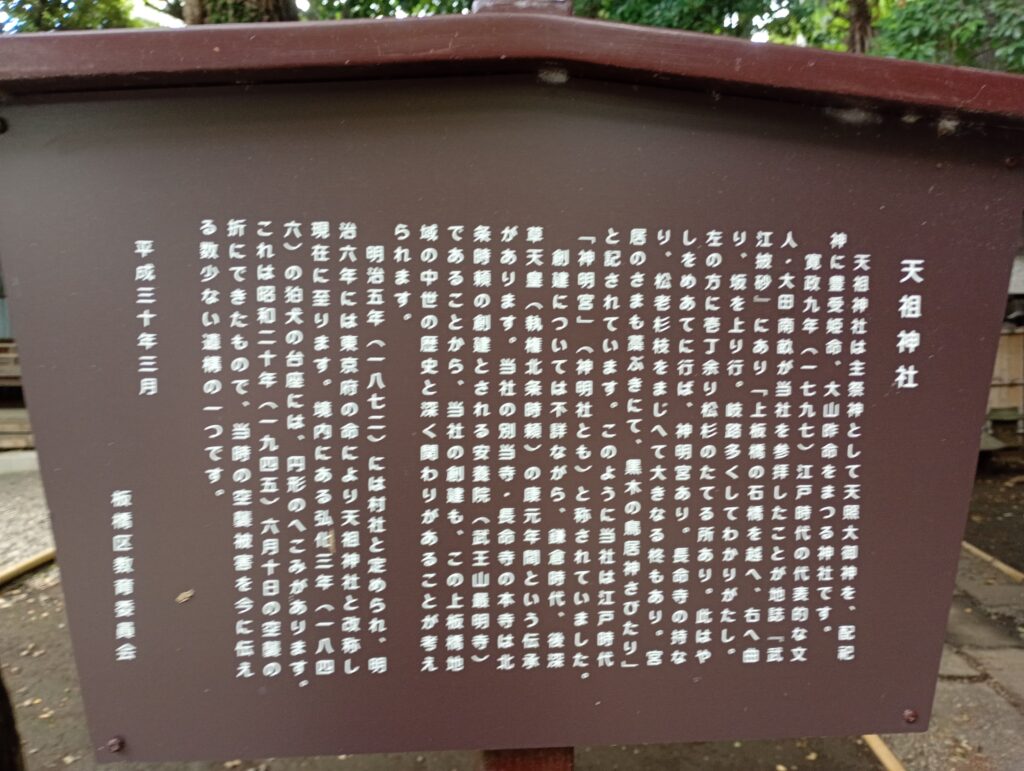 昭和20年(1945年)6月10日、東京は大規模な空襲に見舞われ、板橋区も例外ではありませんでした。このときの銃弾が、神社の狛犬に飛んできたと考えられています。地域の人々が日常的に参拝し、何気なく見過ごしてしまうかもしれないこの傷跡は、平和の尊さを私たちに語りかけています。