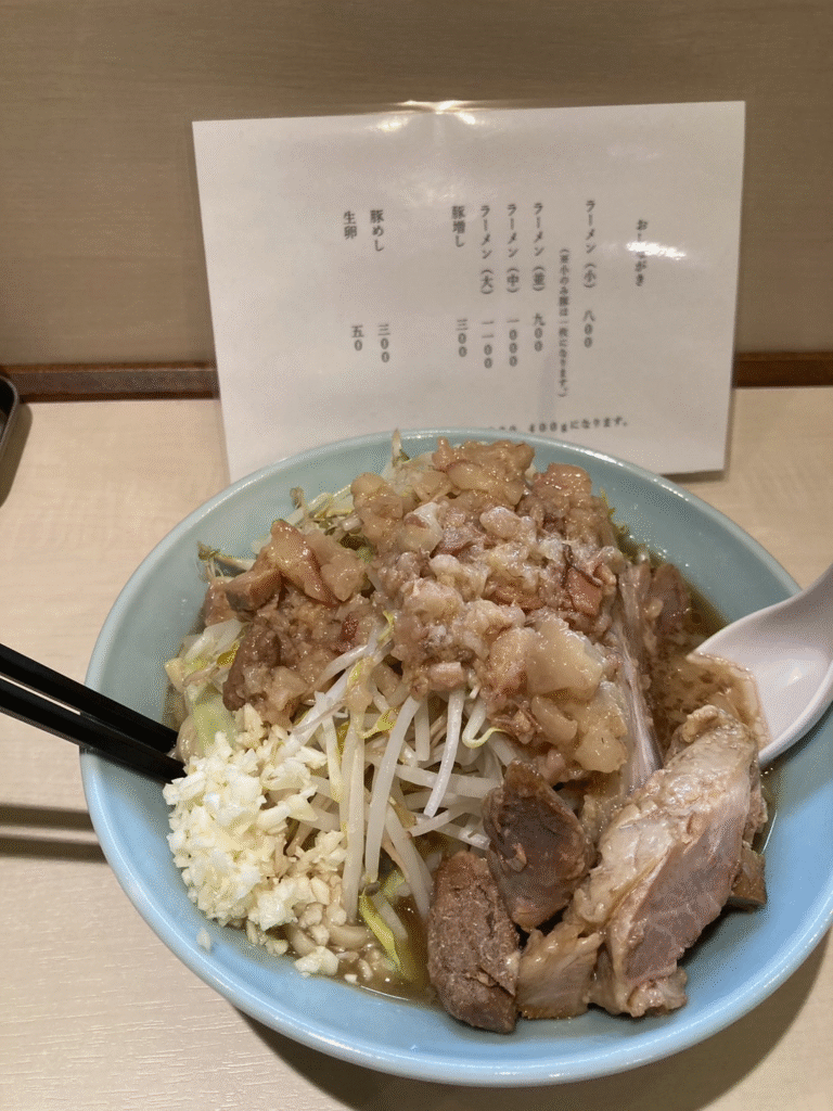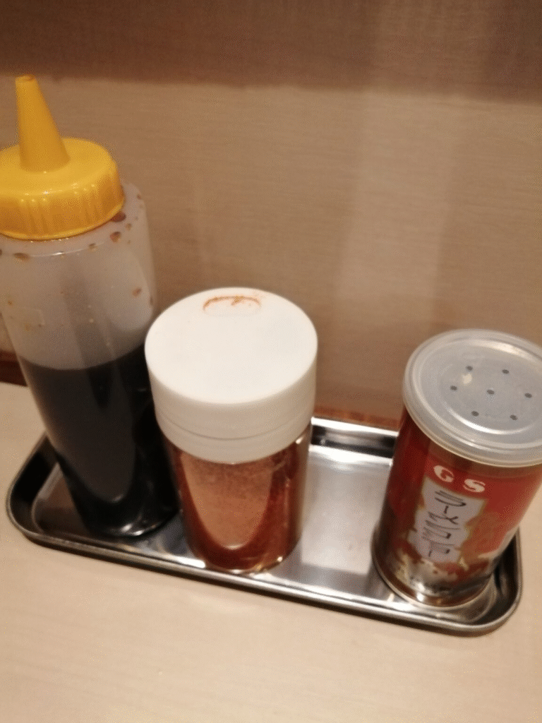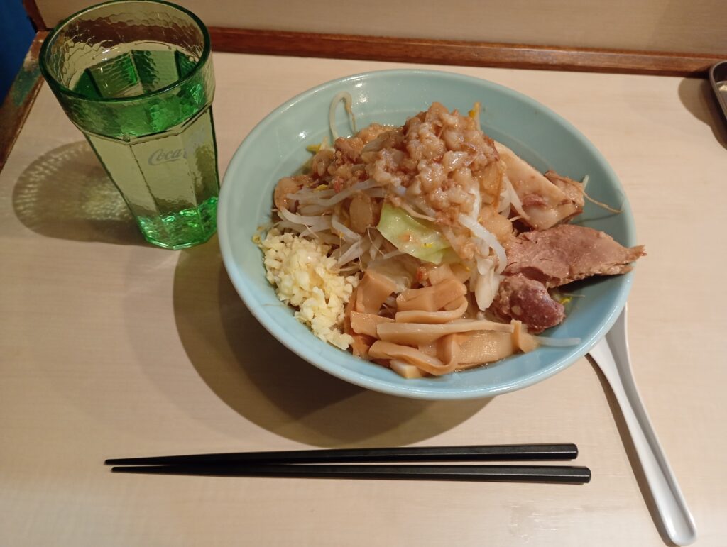 カウンター座ってお箸などを用意して、2,3分で店長から「にんにく入れますか」と聞かれました。そこで、「野菜、にんにく」とお願いしました。お金もカウンター越しにこのタイミングで支払いました(カウンターに置いておくと、店長のタイミングで回収してくれます)。