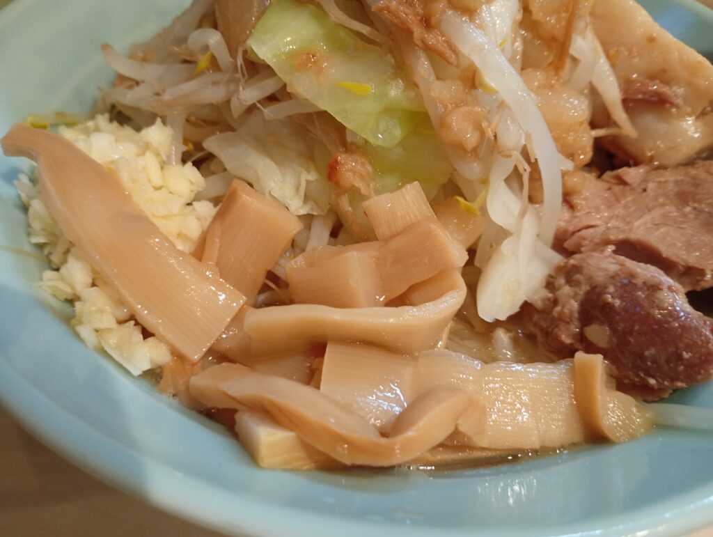 野菜はもやしに加えて適度にキャベツが入っているので触感を楽しめます。また、メンマも肉厚で食べ応えがありました。