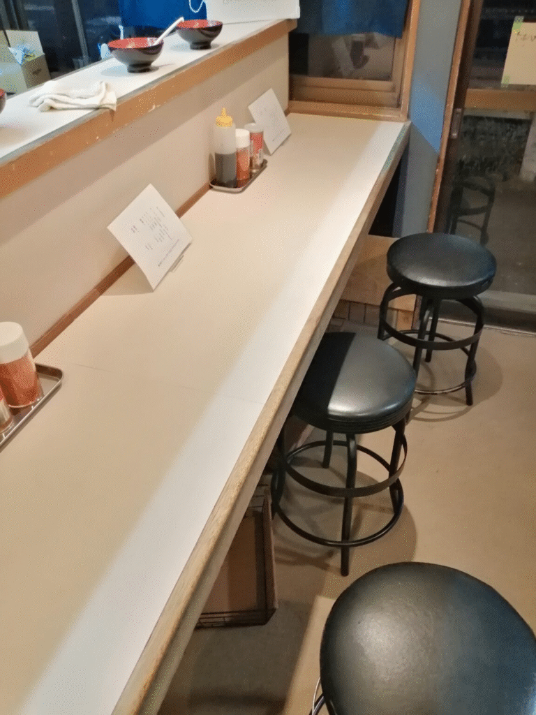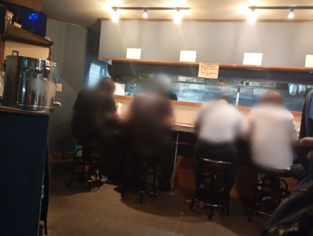 店内はカウンターが5席で店長が一人で注文、お金の受け渡し、調理まで対応しています。15時のオープンから21時まで6時間もワンオペで対応していてただただ凄いです(夏場は暑いので17時オープン)。そして、そんな店長に呼応するように真摯にラーメンに向き合うお客さん。