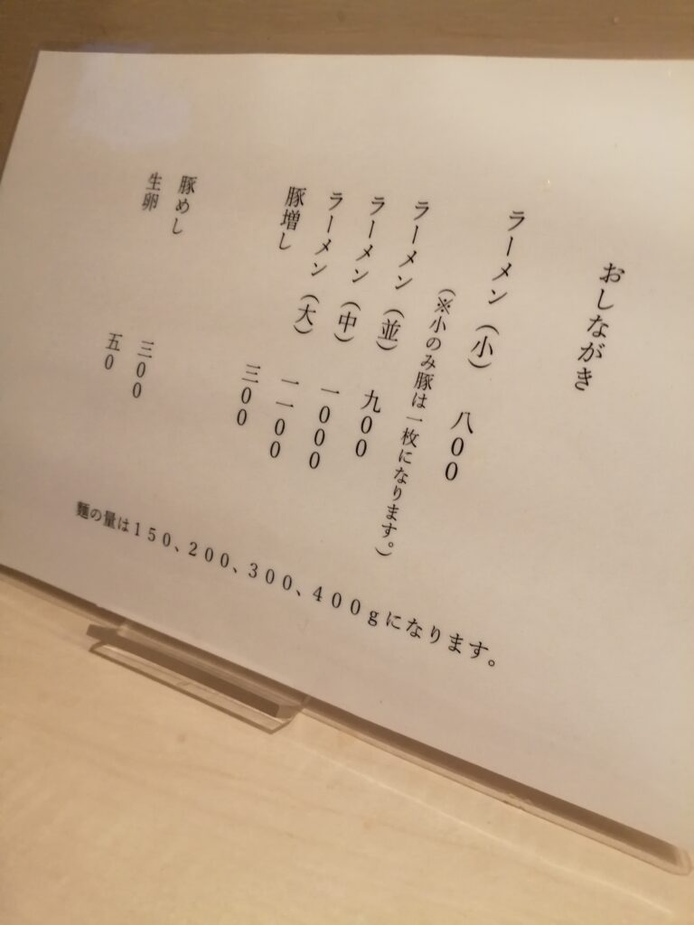 茹でるのに時間がかかるので席につく前に店員さんから注文を聞かれます。ラーメンは麺の量に応じて小150g800円、並200g900円、中300g1,000円、大400g1,100円になっています。また、卓上にあるホワイトボードに「魚粉」や「めんま」、「玉ねぎ」、「うずら」、「ビール」などが日替わりであったりします。