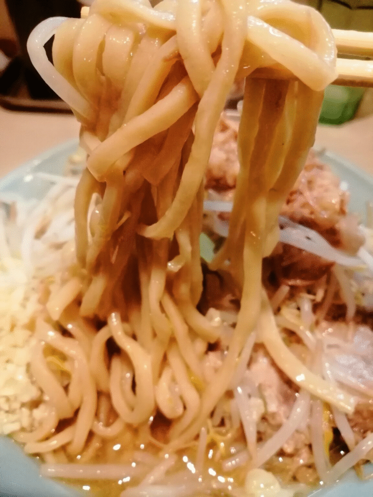適度なワシワシ感ともっちりとした歯触りの太麺を使用。ややうねりがあり、小麦の香りが豊かで、スープとの絡みも抜群です。