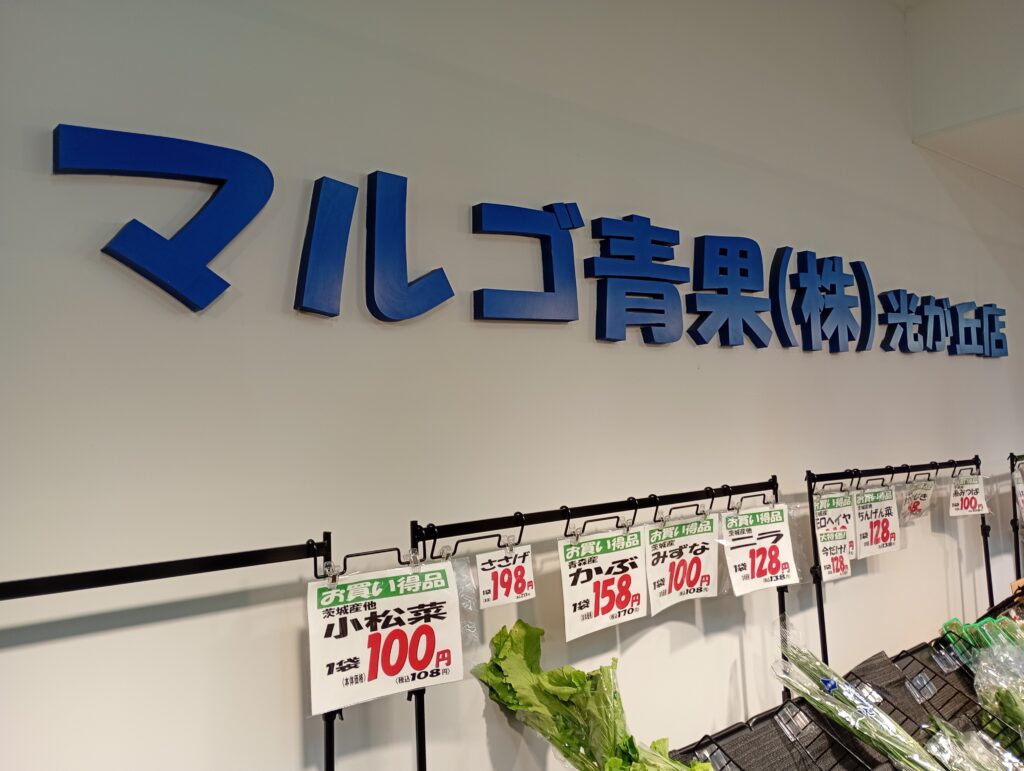 フレッシュひかりは光が丘公園の弓道場がある弓道口の眼の前にあります。路面に面した部分でマルゴ青果さんが野菜や果物を販売しているため、いつも店頭が人で賑わっています。