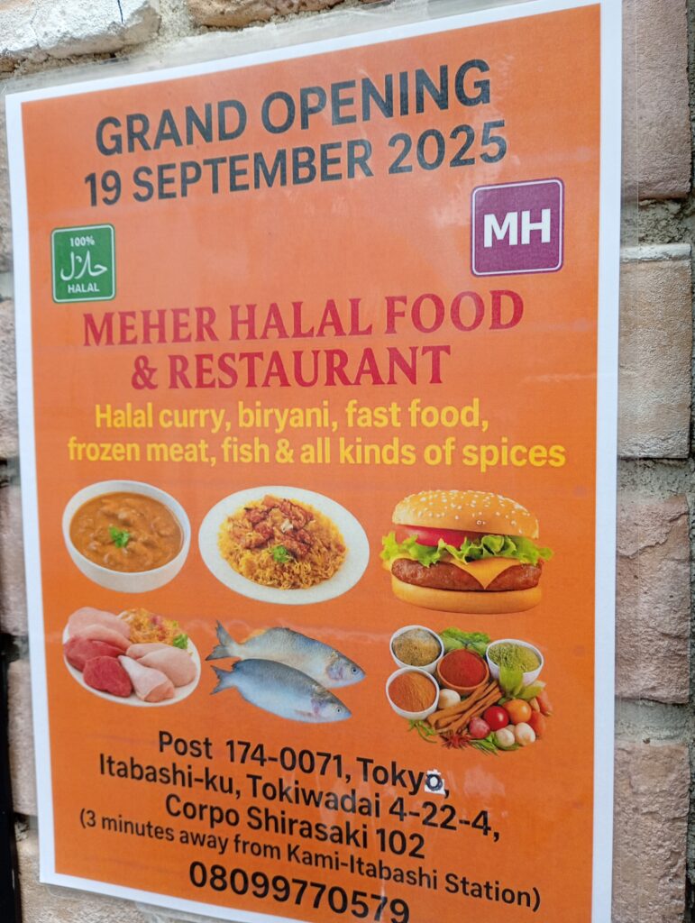 2025年9月19日㈮上板橋北口の教育科学館傍の住宅街に「MEHER HALAL FOOD &RESTAURANT(メヘルハラールフード&レストラン)」さんがオープンします。チキンカレー600円やチキンピリヤニ700円など低価格でハラール料理が食べられるみたいです!